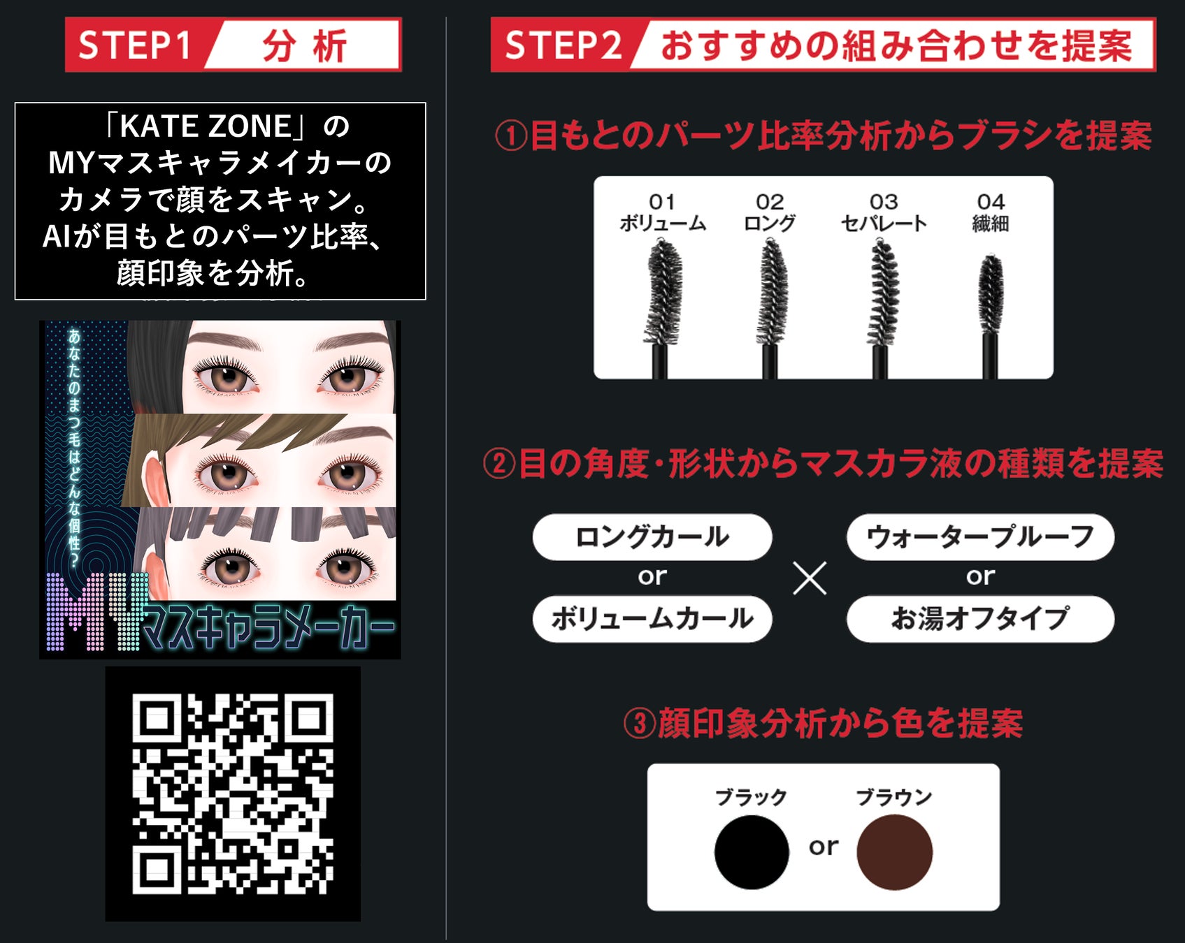 自分に合うマスカラを知りたい、という方には、KATE ZONE内の「MYマスキャラメイカー」がおすすめです。「MYマスキャラメイカー」のカメラで顔をスキャンすると、AIが目もとのパーツ比率・顔印象を分析。一人ひとりに合ったマスカラ液の種類・ブラシ・色の組み合わせを提案してくれます。KATE ZONE内の「MYマスキャラメイカー」でのメイク体験を重ねることで、『KATE MEMBERSHIP PROGRAM』のポイントが貯まる仕組みとなっています。
