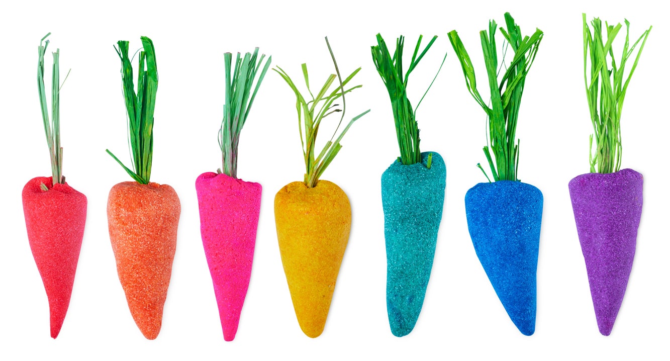 イースターバニーの大好物であるニンジンが虹色のバブルバーになりました。7色揃っているので、レインボウカラーで毎日違う色の泡風呂を楽しんだり、お気に入りの1色を選ぶのもオススメです。ニンジン部分がなくなるまで繰り返し使えるリユーザブルタイプのバブルバーです。