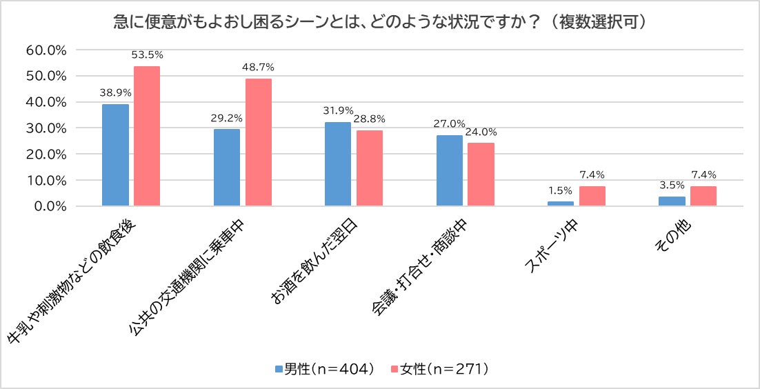 突然襲ってくる便意に悩んでいる675人に「それはどのような状況なのか?」尋ねました。男女で約15ポイントの差はありましたが「牛乳や刺激物などの飲食後」(男性:38.9%、女性:53.5%)が共にトップ。男性の次点は「お酒を飲んだ翌日」(男性:31.9%、女性:28.8%)、女性の次点は「公共の交通機関に乗車中」(男性:29.2%、女性:48.7%)となり、「公共の交通機関に乗車中」も男女で約20ポイントの差が見られました。また、「会議・打合せ・商談中」(男性:27.0%、女性:24.0%)も目立ちました。