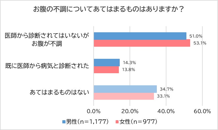 「下痢しやすいか?」と尋ね、「はい」と答えた男性39.2%(1,177人)と女性32.6%(977人)に「お腹の不調についてあてはまるものはあるか?」尋ねました。約半数の男女が「医師から病気と診断されてはいないが不調」(男性:51.0%、女性:53.1%)と答え最多でしたが、「既に医師から病気と診断された」(男性:14.3%、女性:13.8%)も1割超いました。