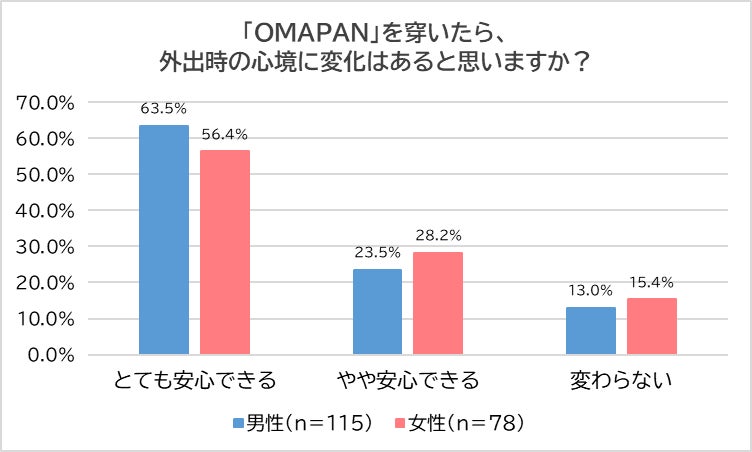 そこで、最後に「下痢をチビってもバレない機能性下着『OMAPAN』を穿いたら、外出時の心境に変化はあると思うか?」と尋ねたところ、「とても安心できる」(男性:63.5%、女性:56.4%)、「やや安心できる」(男性:23.5%、女性:28.2%)となり、8割超が「OMAPAN=安心」と思っていることがわかりました。