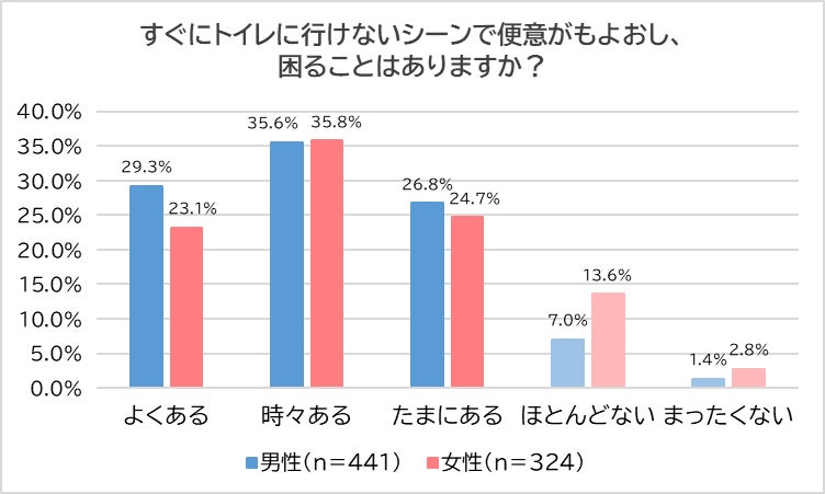 続いて、下痢の頻度が「週1回以上」「ほぼ毎日」の765人に「すぐにトイレに行けないシーンで便意がもよおし、悩むことはあるか?」尋ねました。男女共に最も多かったのは「時々ある」(男性:35.6%、女性:35.8%)で、「よくある」(男性:29.3%、女性:23.1%)、「たまにある」(男性:26.8%、女性:24.7%)となり、女性の83.6%、男性では91.7%が突然襲ってくる便意に悩んでいることがわかりました。