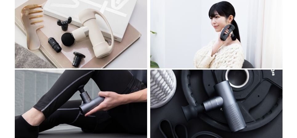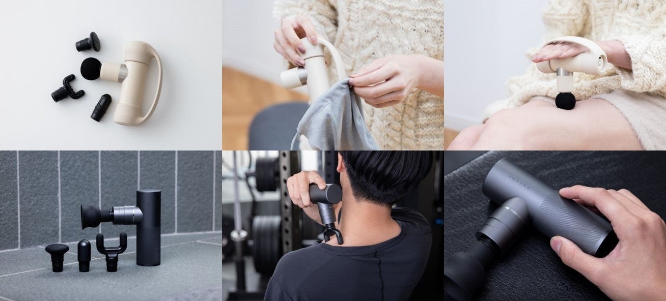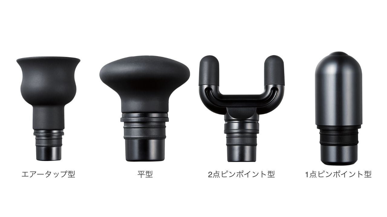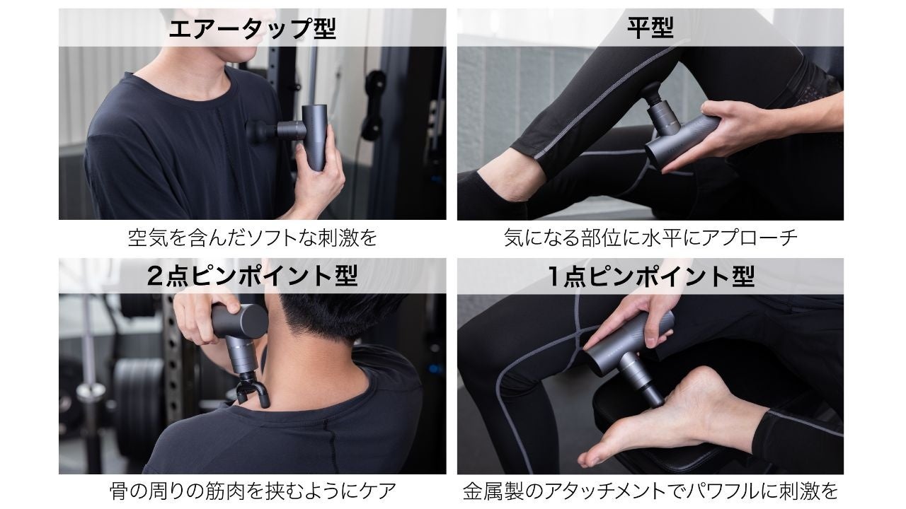 スポーツケアモデルは、空気を含み、リズミカルに打ち付けるプロの手技の再現を目指した「エアータップ型」、金属製のアタッチメントでパワフルに刺激する「1点ピンポイント型」など、状態に合わせた刺激を選べる4つのアタッチメントによって運動前後ウォームアップ・クールダウンをサポートします。