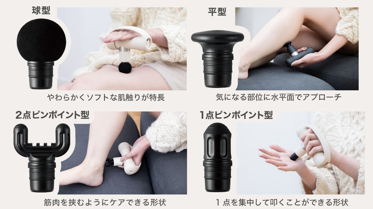 ■振動を当てたい部位やお好みにあわせてアタッチメントを4種類から選べます。