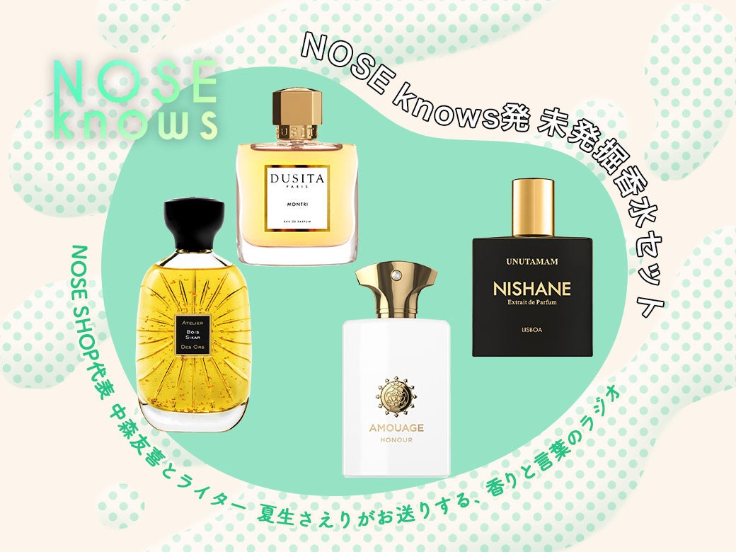 ラインアップは2月27日(火)公開のエピソード「#72 【販売0本】まだ魅力が見つかっていない香水をキットで販売!」と連動しており、「NOSE knows発 未発掘香水セット」と題して、NOSE SHOP オンラインストアで販売中。