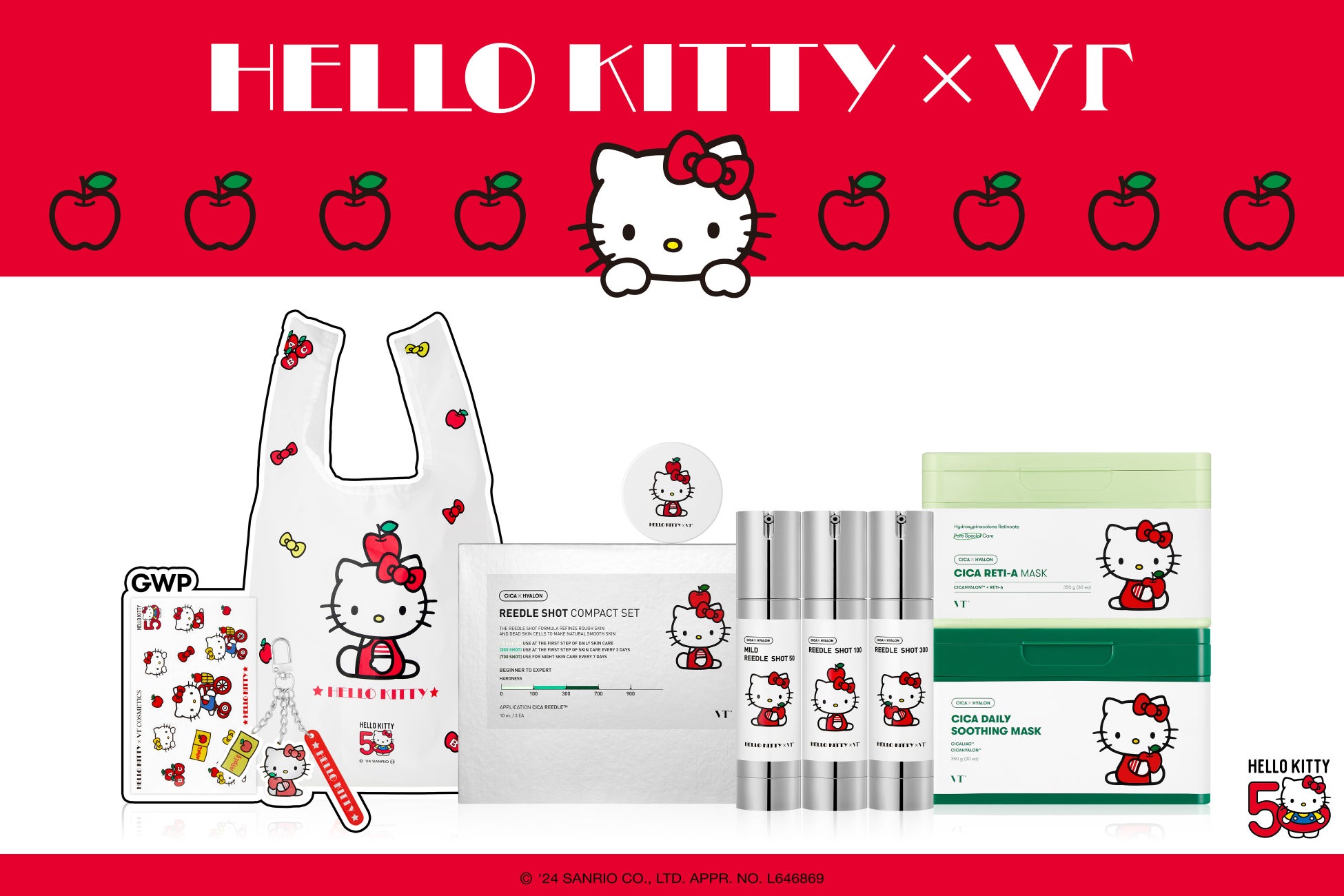 株式会社サンリオの人気キャラクター、ハローキティが50周年を迎え、VTの人気商品とスペシャルコラボ!VTの定番商品である「CICA スージングマスク」から今話題の「リードルショット」まで、その他複数の商品とコラボします。ハローキティとのコラボ商品で毎日のスキンケア時間が楽しくなること間違いなし!