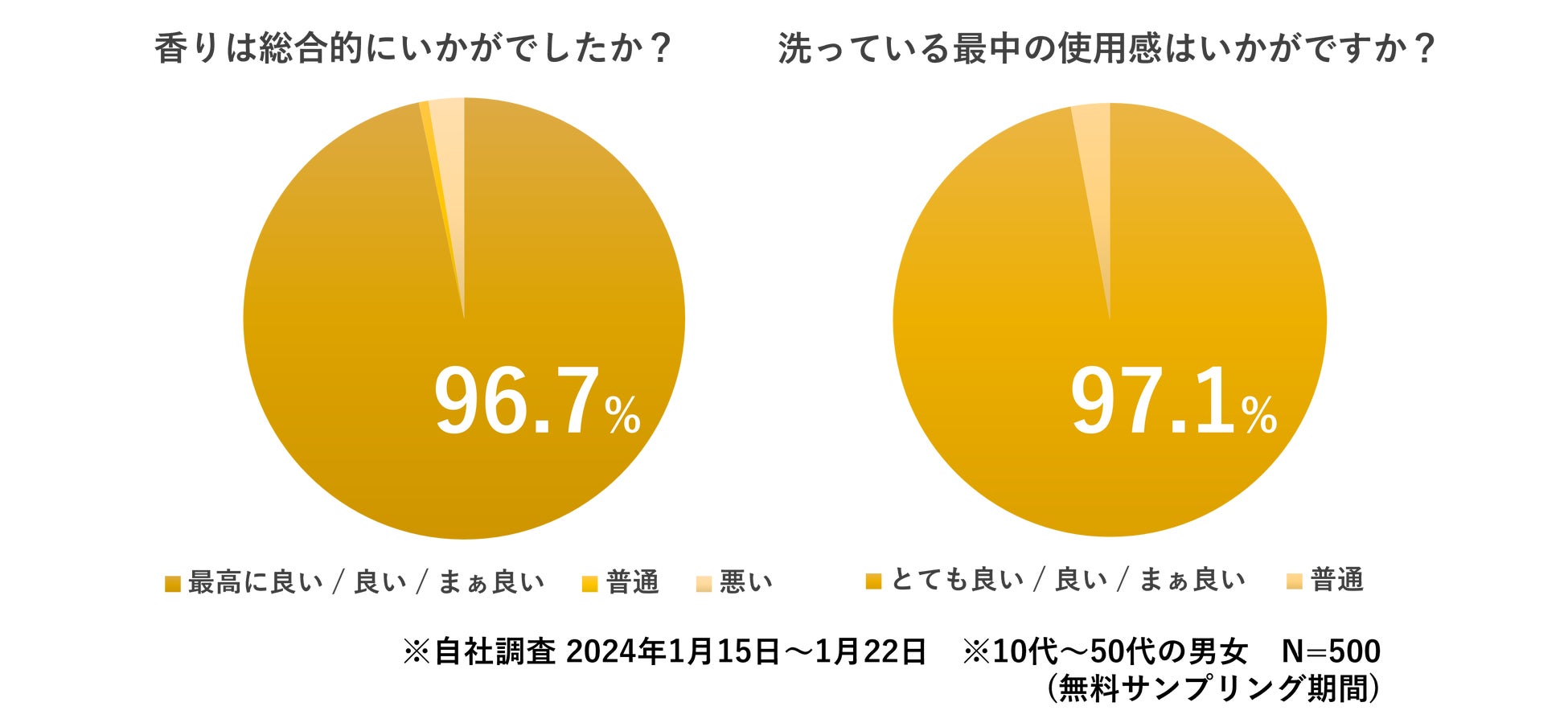 「泡立ち、香り、洗い流した後のすべてがパーフェスト!」「オールインワンシャンプーのイメージを覆す優しい洗い心地!」などの反響があり、これまでオールインワンシャンプーに抵抗があった方からも高い評価を頂いております。特に、10代~40代のお客様にご好評の声をいただきました。