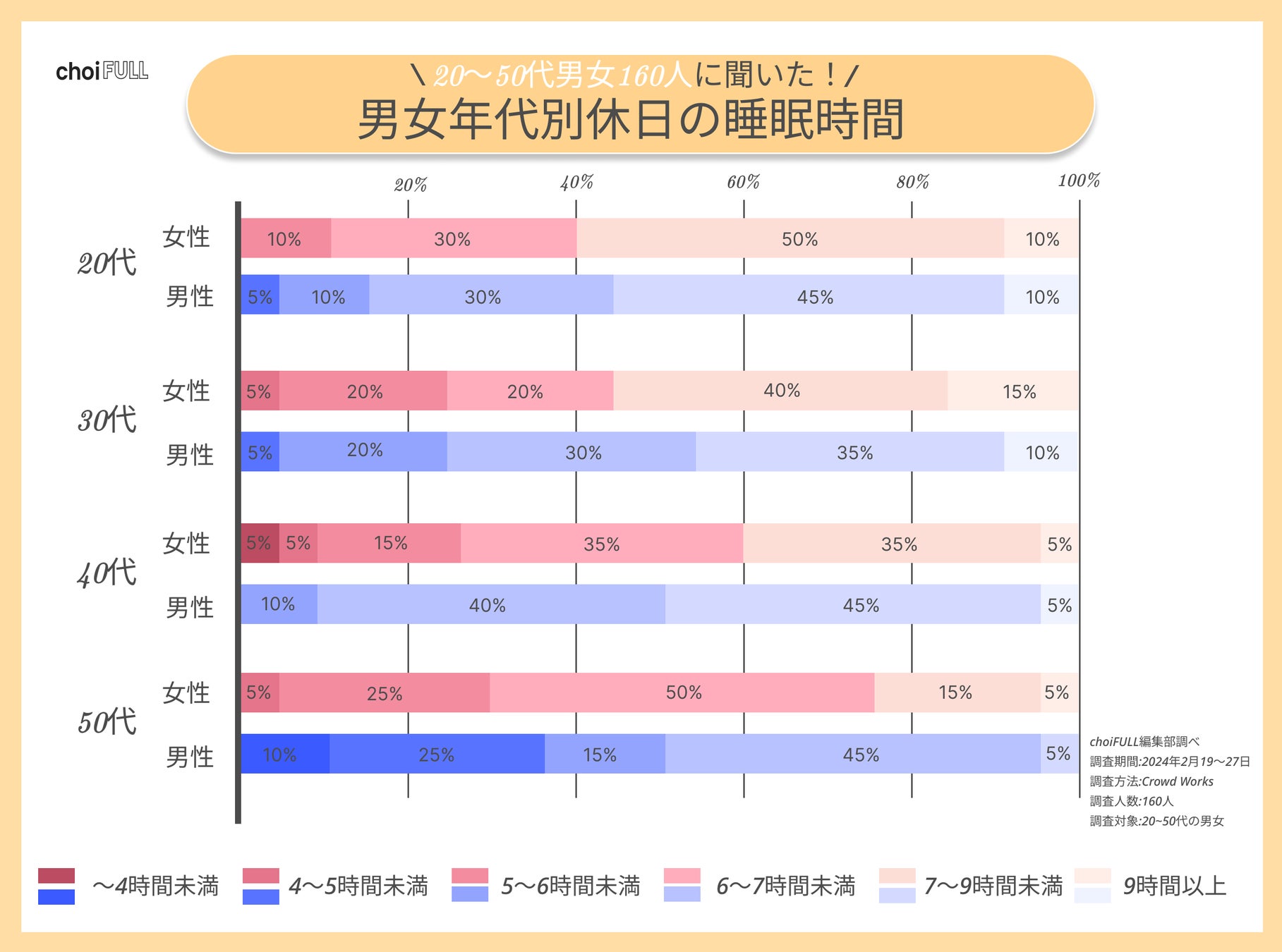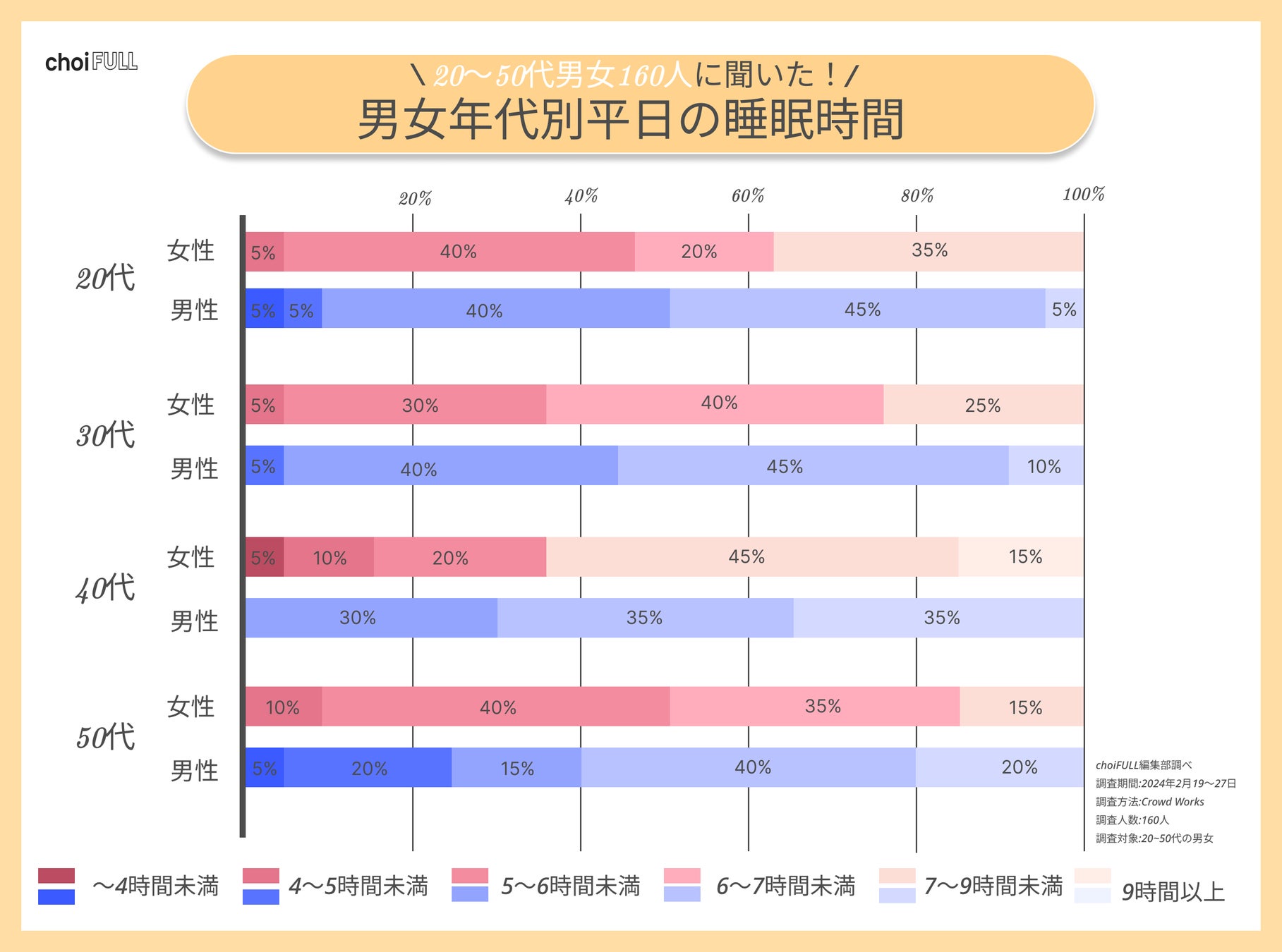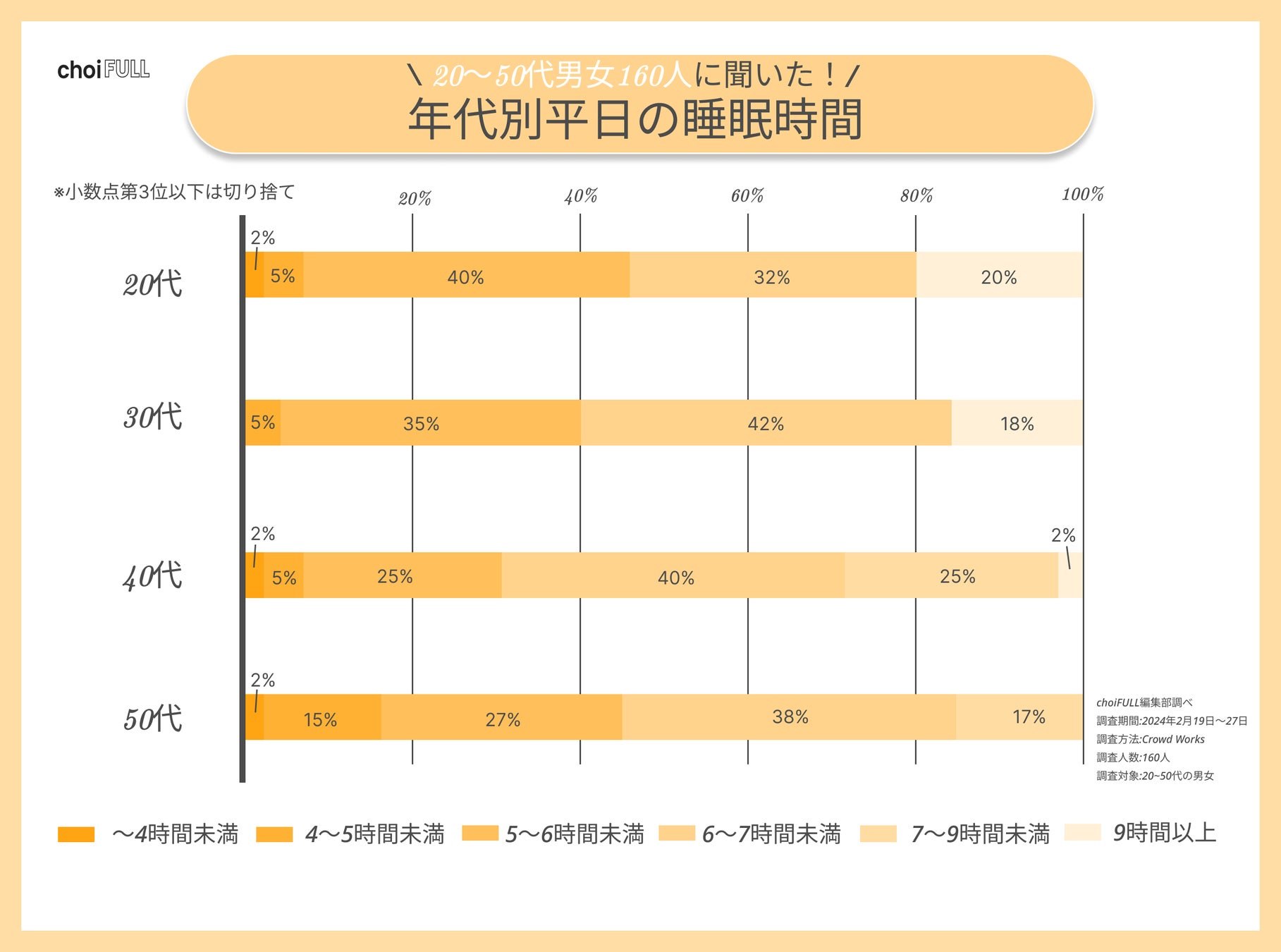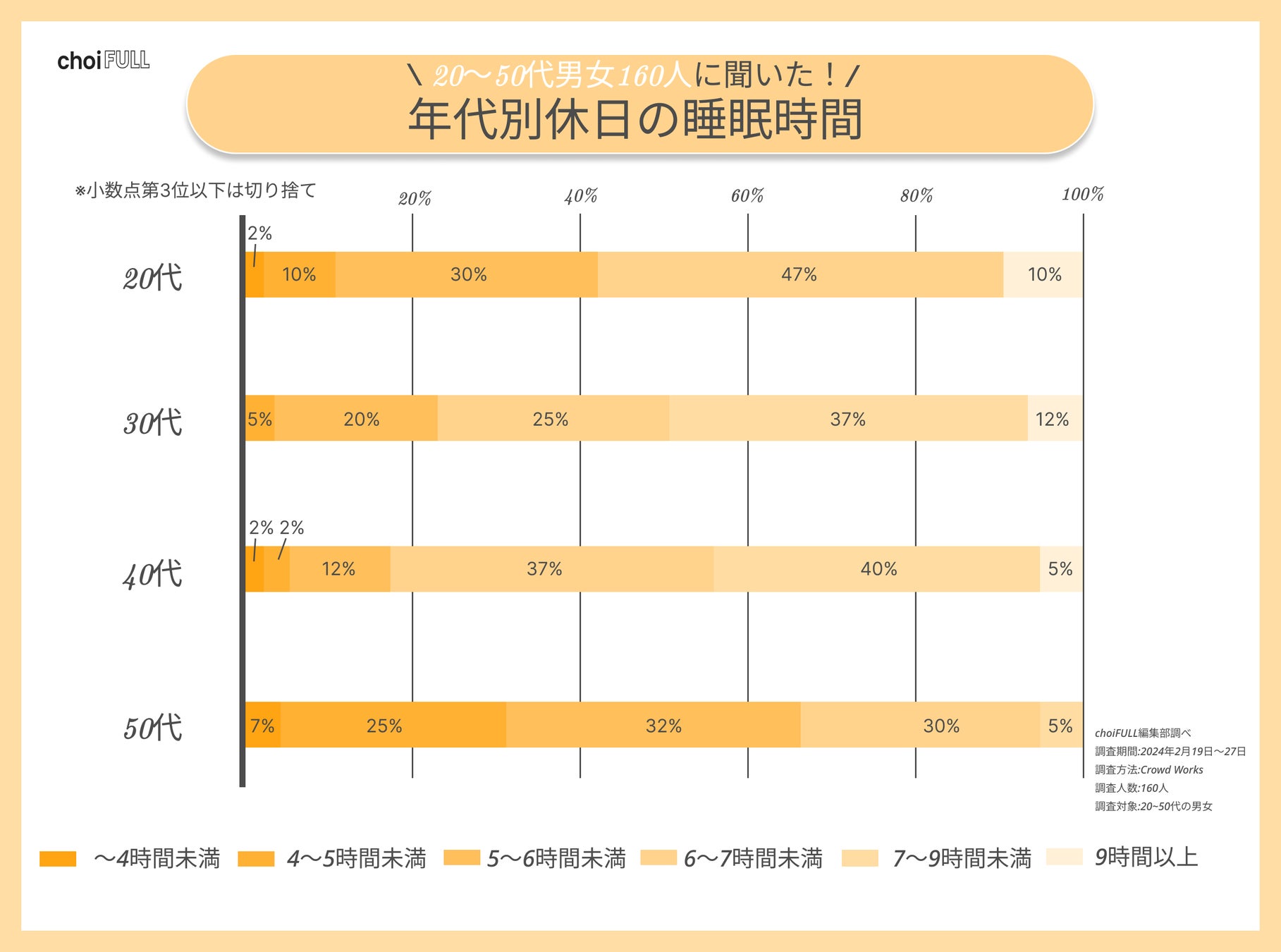 20〜50代男女160人に平均睡眠時間や睡眠満足度を聞きました。