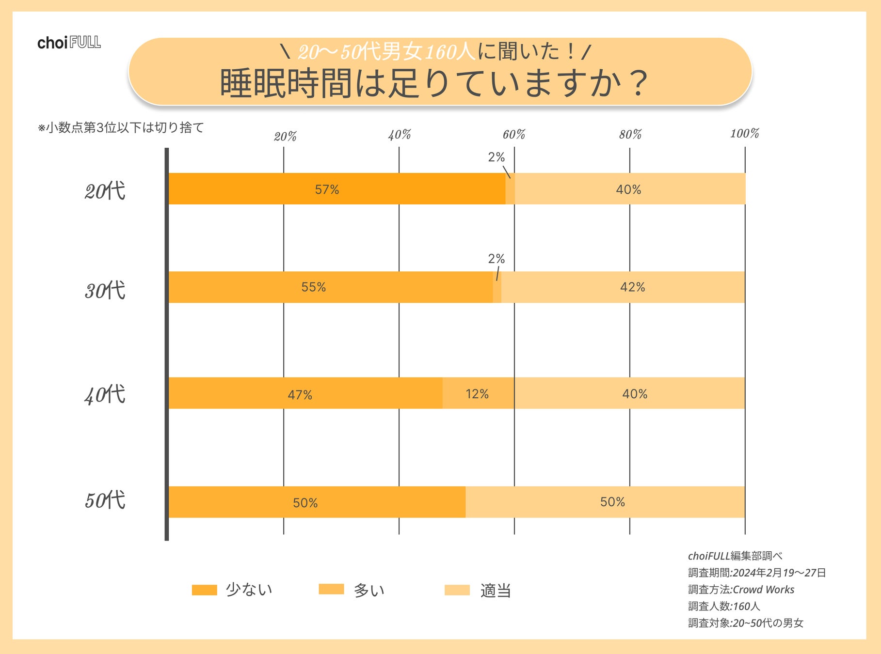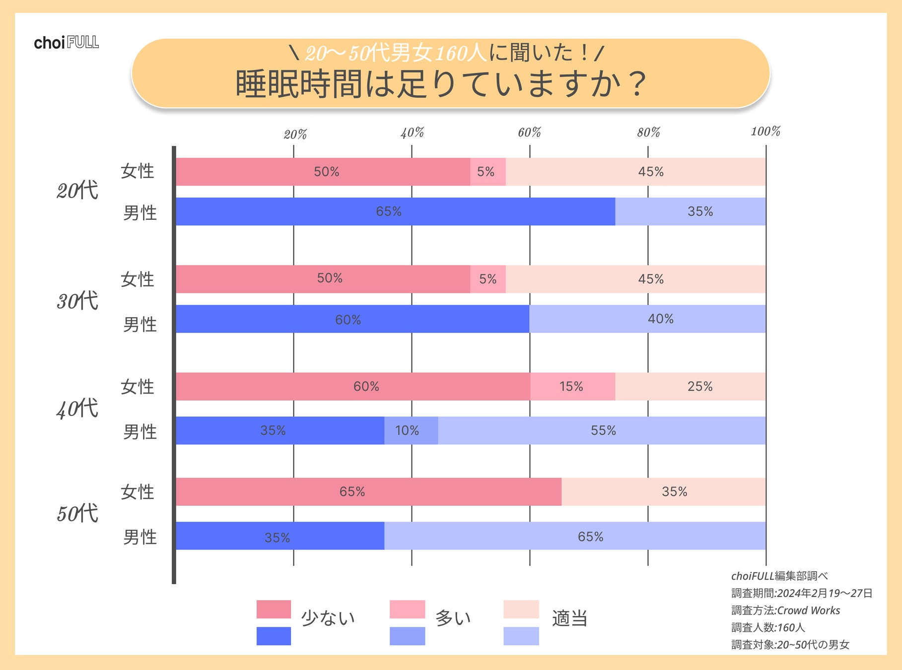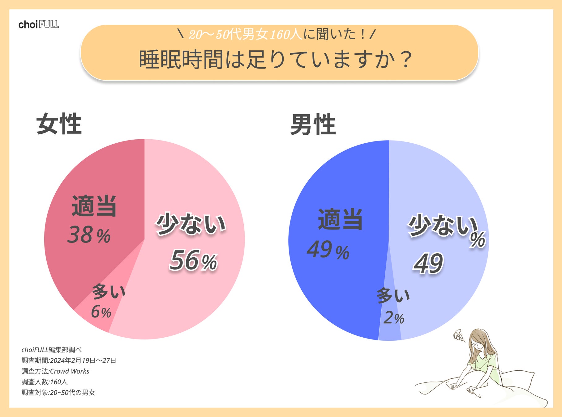 20〜50代男女160人にアンケートしたところ、睡眠時間が多いと感じている人は4%という結果になりました。また、20代や30代の約6割が少ないと回答し、他の年代と比較すると多いです。さらに、性別ごとに比べると、睡眠時間が少ないと考えている女性は半数以上いました。そのように回答した理由は以下が挙げられます。