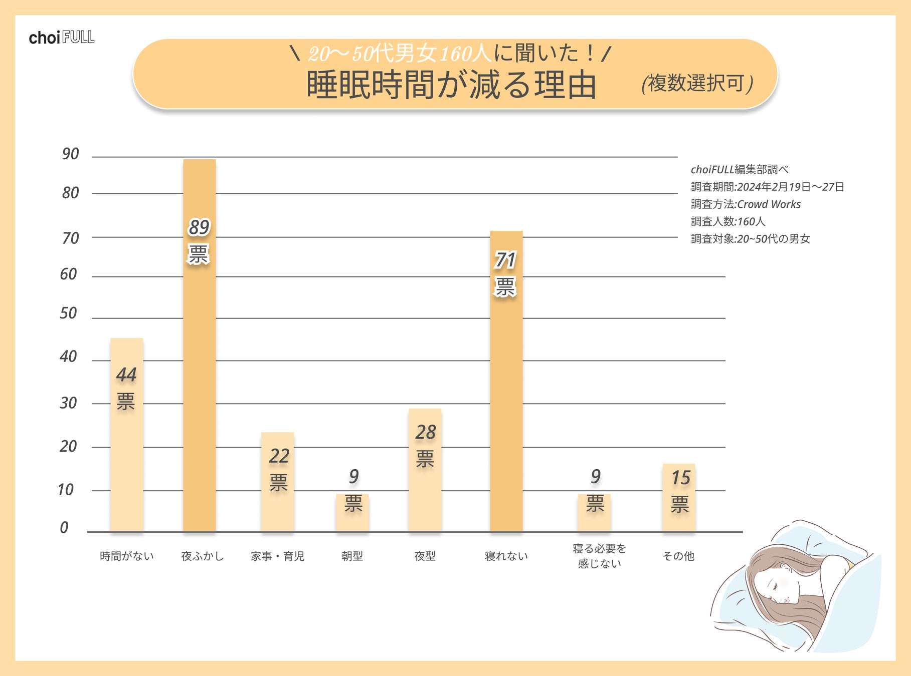 20〜50代の男女160人にアンケートした結果、半数以上が夜ふかしが原因で睡眠時間が減少しているとわかりました。さらに、4割以上が「寝れない」と回答。このように回答した理由は、以下が挙げられます。