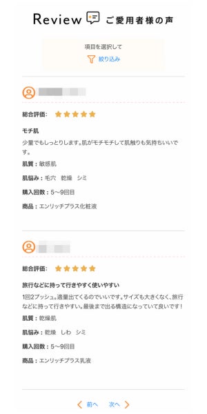 ファンケルが提供するエイジングケアライン「エンリッチプラス」の新規獲得用LPにLetroを活用してレビューを掲載し、運用を開始しました。まず初めにファンケルが保有するレビューデータを「顧客データインポート機能」を活用してLetroにインポートし、オンラインで活用可能なレビューコンテンツにしてサイト上に掲載しました。レビュー項目には、「肌質」や「肌悩み」「購入回数」などを盛り込むことで、お客様が自身にあった情報を選択し、閲覧してもらうことを狙いました。さらに、商品を通して顧客が感じる「感動」や「変化」といった”体験価値”を伝えることで、潜在顧客の申し込み意向の後押しに成功、CVR約1.8倍にすることができました。