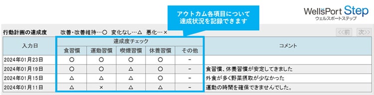 ・アウトカムの各項目に行動計画を立て、継続支援から実績評価まで各項目の評価ができます。