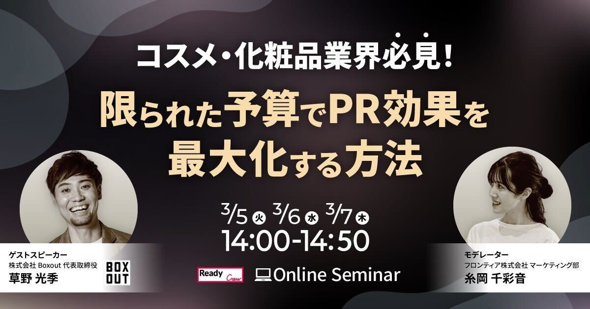 このような声にお答えすべく、企業のSNSマーケティング支援のプロフェッショナルである株式会社Boxout 代表取締役 草野 光季 氏 をゲスト講師に招き、商品のプロモーションに課題を感じているコスメ・化粧品業界の方に「よくある課題に対する対策」や「最新のPR手法の例」を、Q&A形式にてご解説いただくウェビナーを開催いたします。