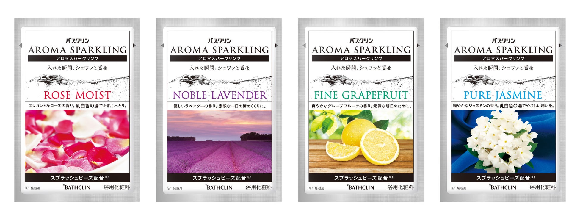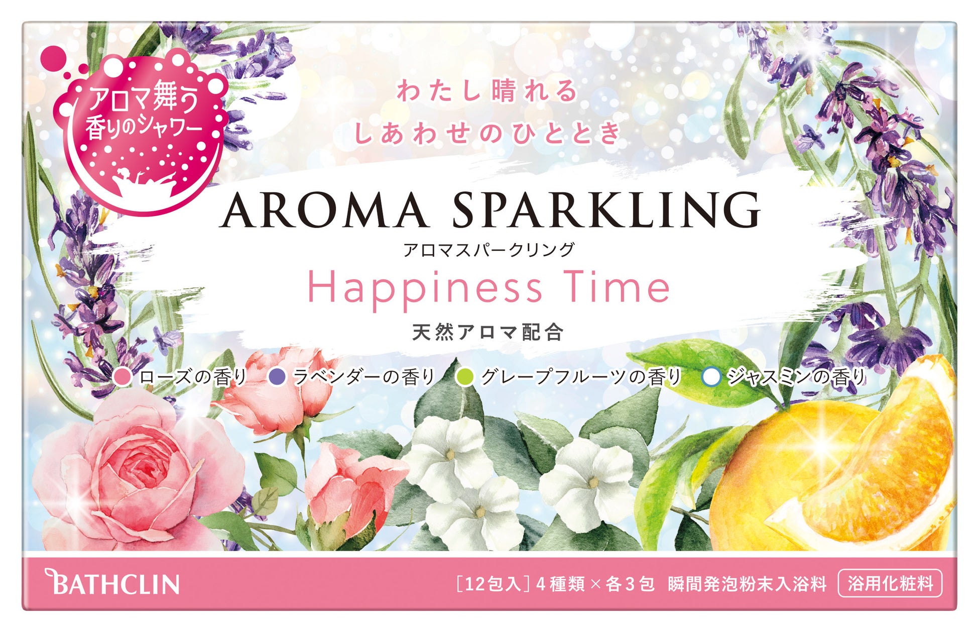 株式会社バスクリン(本社:東京都千代田区 社長:三枚堂正悟)は、スプラッシュビーズ(発泡剤)の発泡で、浴室いっぱいに香りがはじけて広がる入浴料「アロマスパークリング」より、花や果実の香りを4種セレクトした「アロマスパークリング Happiness Time」を3月11日(月曜日)に新発売いたします。天然アロマの香りに包まれる、しあわせのひとときをお楽しみください。