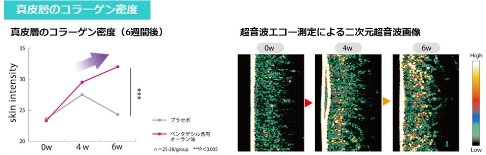 ランダム化プラセボ対照二重盲検並行群間比較試験を実施。ペンタデシル含有オーラン油入りサプリメント6週間継続摂取群は、プラセボ摂取群と比べ、真皮層のコラーゲン密度が有意に増加しました。
