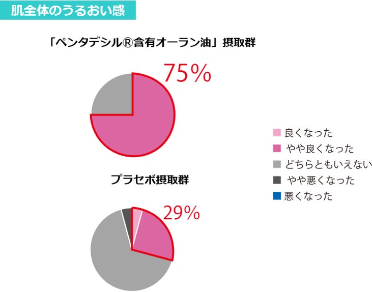 ペンタデシル含有オーラン油を配合したサプリメント服用後のアンケートを実施したところ、ペンタデシル含有オーラン油入りサプリメント8週間継続摂取群は、プラセボ摂取群と比べて、肌全体のうるおい感が良くなったと感じる人が多数いました。また、プラセボ摂取群では、やや悪くなった方がいましたが、ペンタデシル摂取群では、やや悪くなったと感じる方がいない結果となったことから、肌の潤いの効果は、ペンタデシルの効果であると推察されます。