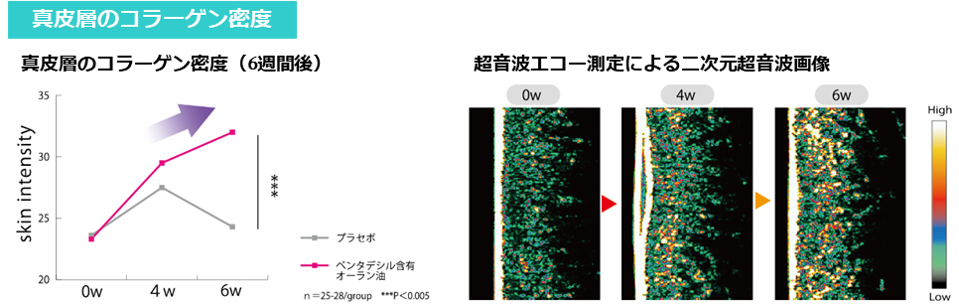 ランダム化プラセボ対照二重盲検並行群間比較試験を実施。ペンタデシル含有オーラン油入りサプリメント6週間継続摂取群は、プラセボ摂取群と比べ、真皮層のコラーゲン密度が有意に増加しました。