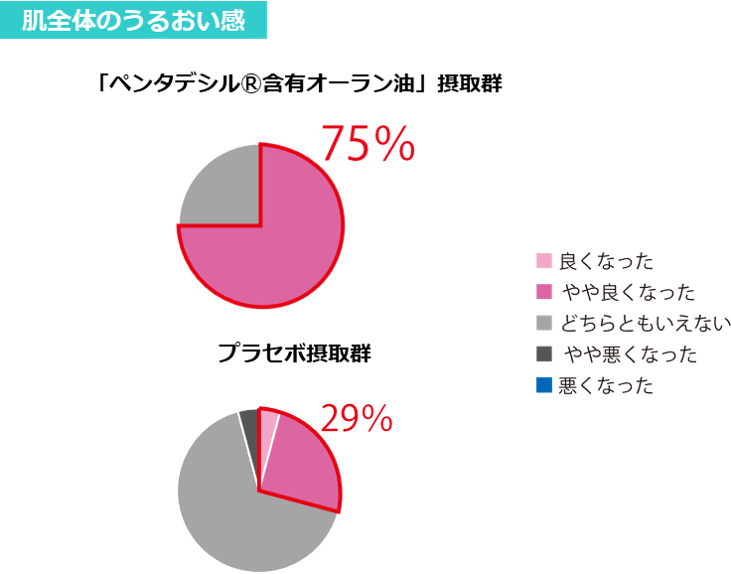 ペンタデシル含有オーラン油を配合したサプリメント服用後のアンケートを実施したところ、ペンタデシル含有オーラン油入りサプリメント8週間継続摂取群は、プラセボ摂取群と比べて、肌全体のうるおい感が良くなったと感じる人が多数いました。また、プラセボ摂取群では、やや悪くなった方がいましたが、ペンタデシル摂取群では、やや悪くなったと感じる方がいない結果となったことから、肌の潤いの効果は、ペンタデシルの効果であると推察されます。