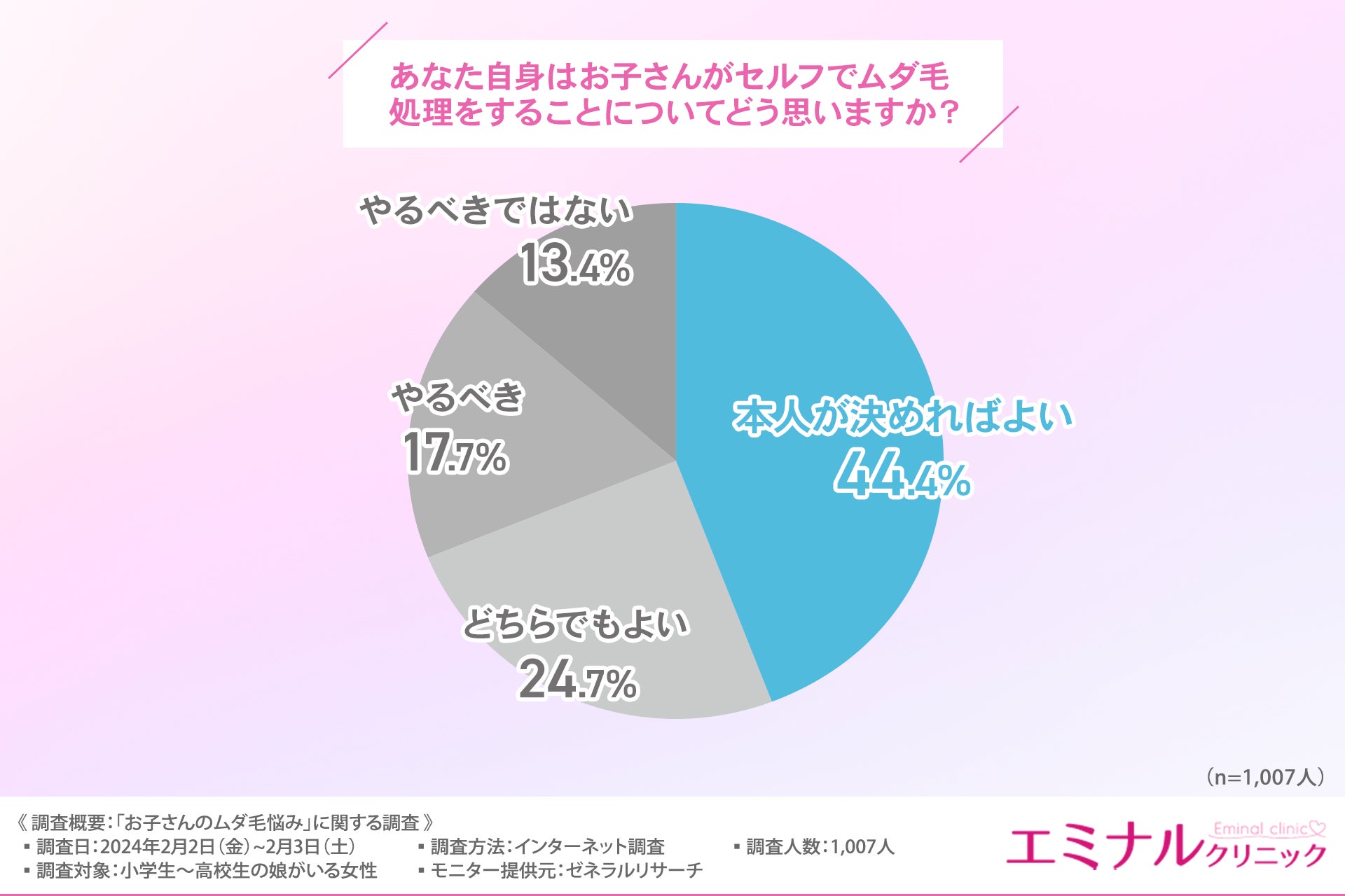 「あなた自身はお子さんがセルフでムダ毛処理をすることについてどう思いますか?」と質問したところ、『本人が決めればよい(44.4%)』という回答結果になりました。