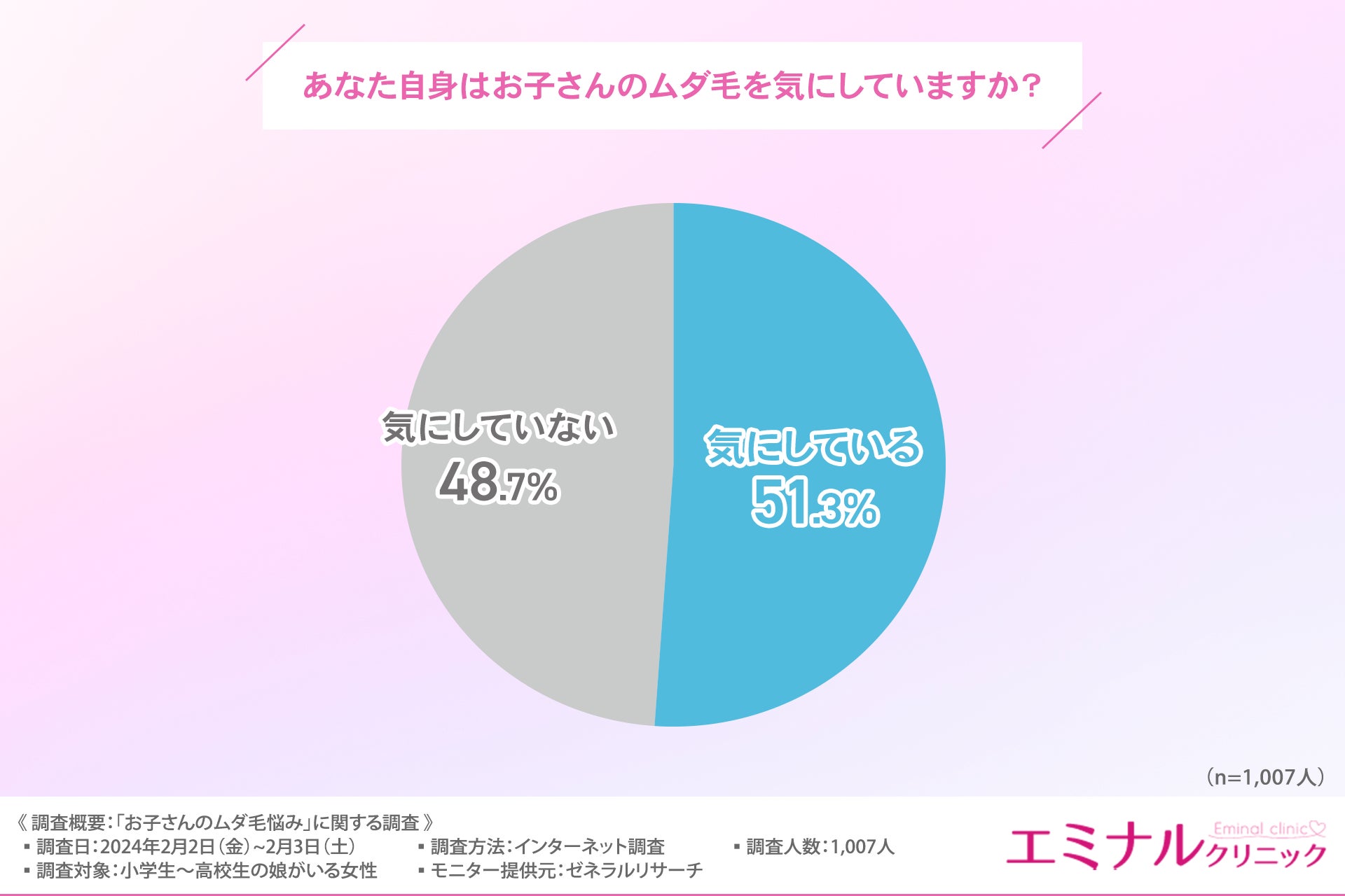 「あなた自身はお子さんのムダ毛を気にしていますか?」と質問したところ、『気にしている(51.3%)』という回答結果になりました。