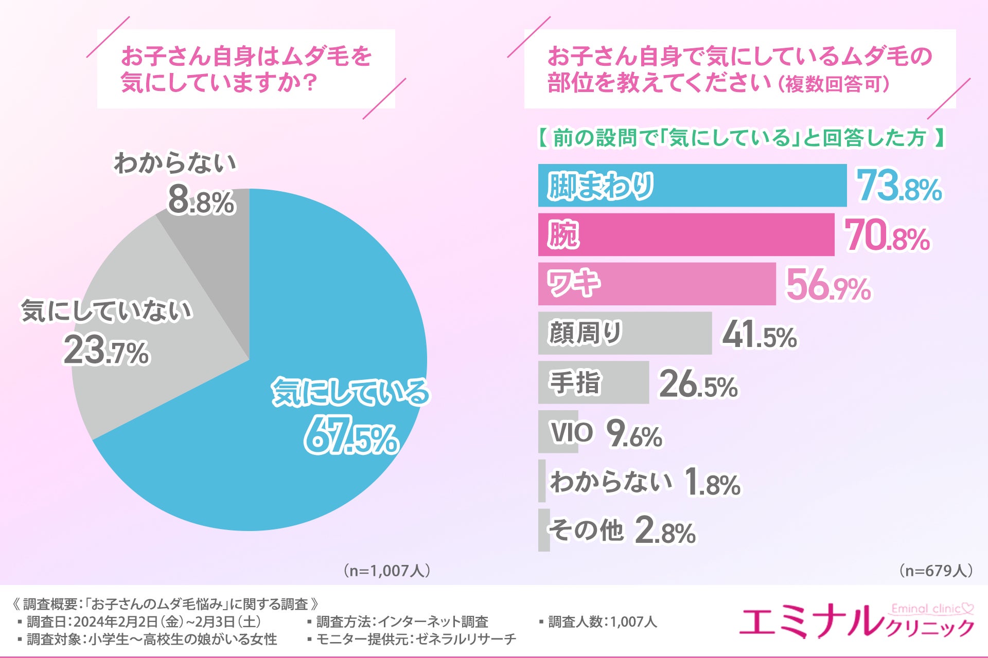 そこで今回、医療脱毛を手掛けるエミナルクリニックhttps://eminal-clinic.jp/lp01/?refmedia=11073)は、小学生~高校生の娘がいる女性を対象に「お子さんのムダ毛悩み」に関する調査を実施しました。