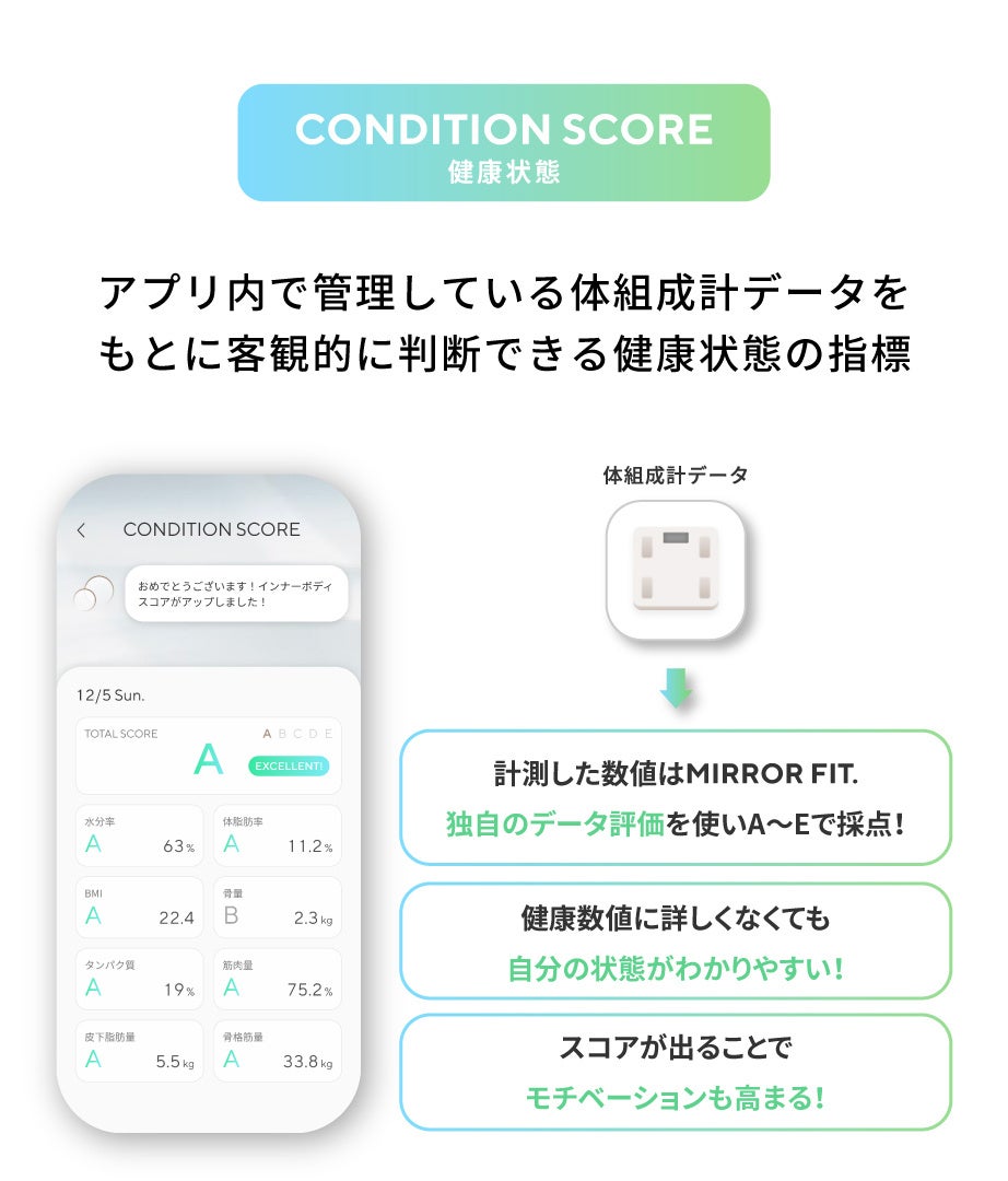 モバイルから取得できる膨大なヘルスケアデータベースや自社の「MIRROR FIT. スマート体組成計」から取得できるデータをもとに健康習慣や健康状態を独自のスコアを用いて客観視することが可能になります。