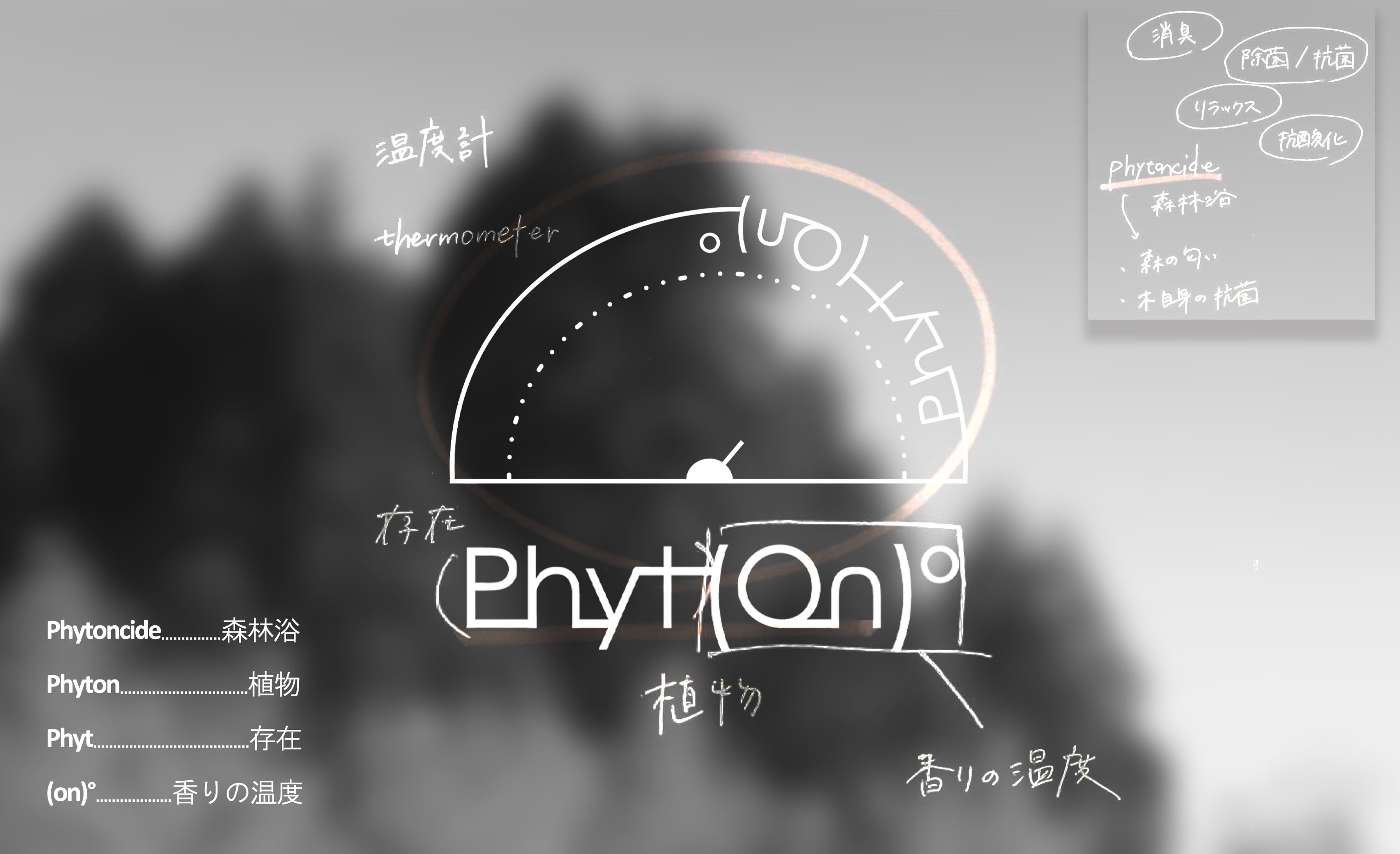 木々が外敵から身を守るために香りの成分を発する「フィトンチッド(phytoncide)」という作用を、人は森林浴として体感している。phytonは植物という意味の単語。そして、Phytは”存在”、(on)°は香りの温度を指している。ロゴのモチーフは温度計で、香りから連想する温度を表現し、浮遊や繋がりを視覚化している。