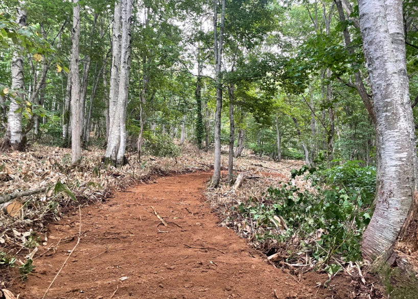 プロダクトの原料となる素材は、全て自社の管理する森から採れた枝葉を使用している。森林保全のための林業を行う中で生産された端材を手作業で収穫し、樹種ごとに選別している。(下記の写真は実際に木材を搬出するためにつけた作業道:木こりの野中が施業)