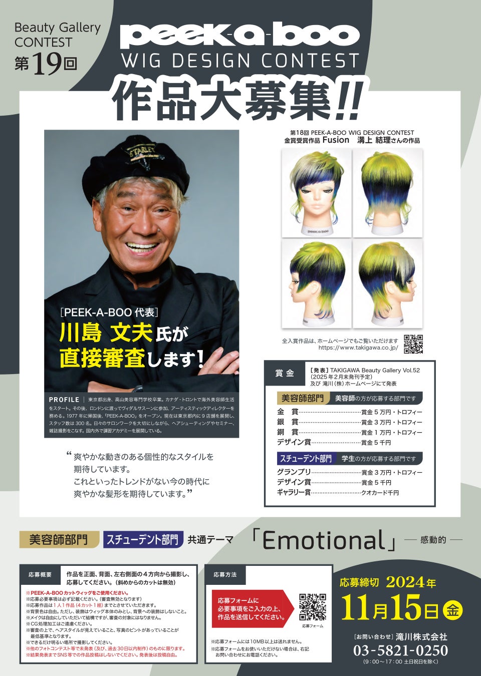 このコンテストは、滝川株式会社がサロンで頻繁に使用する理美容小物やエステティック・ネイル商材の紹介、情報発信ツールとして、年2回(春・秋)発刊している商品カタログ「タキガワビューティギャラリー」の誌面上で行っているフォトコンテストです。審査員にはPEEK-A-BOO代表の川島文夫氏をお迎えし、学生を含む美容に関わる皆様が、テーマに沿って個々を表現できる場としてご活用いただいています。