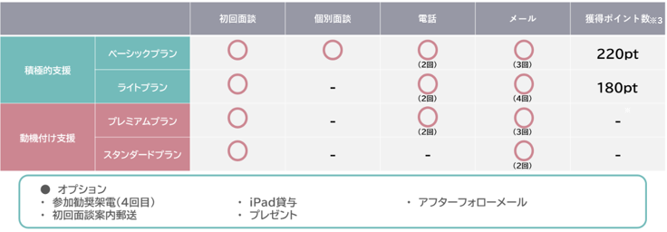 積極的支援、動機付け支援それぞれ独自のプランを用意しており、企業の希望する支援内容や価格に合わせてプランを選択することが可能です。また、オプションを合わせて利用することでより効果的にプログラムを実施することができます。