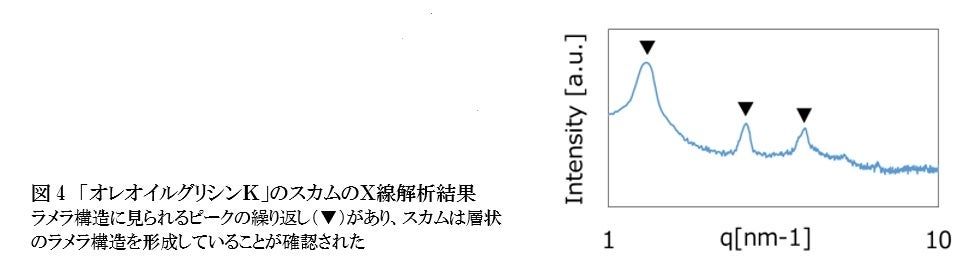 次に、「オレオイルグリシンK」と水道水中の金属イオンで形成されたスカムの構造を、X線にて構造解析(X線小角散乱法※5)を行いました。