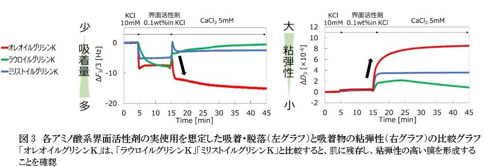その結果、「オレオイルグリシンK」は、肌への吸着量が時間とともに増加していく傾向が確認され(図3左グラフ)、その吸着物は粘弾性※4が高いことが分かりました(図3右グラフ)。
