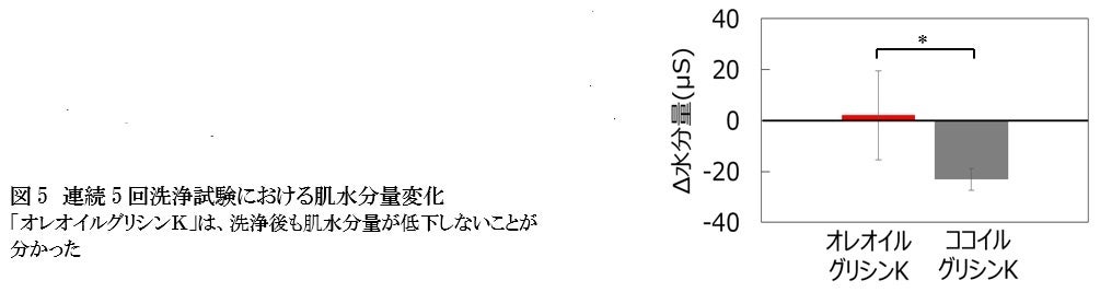 前腕内側部を5回洗浄した後、肌の水分量を測定した結果、「ココイルグリシンK」は、洗浄前に比して大きく水分量が低下しましたが、「オレオイルグリシンK」は、水分量が低下しないことが確認されました(図5)。つまり、洗顔後の肌の水分量は維持されていることが示唆されました。