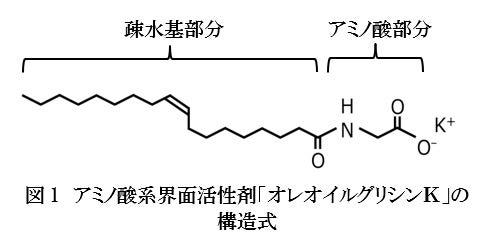 新規アミノ酸系界面活性剤を設計するにあたり、水になじみやすい部分として、一般的に用いられるアミノ酸の中でも泡立ちや感触の面から汎用されるグリシンと、油分になじみやすい疎水基部分として脂肪酸の組み合わせを、検討しました。その結果、グリシンと脂肪酸のオレイン酸※2による新規アミノ酸系界面活性剤として「オレオイルグリシンK」(図1)の開発に成功しました。