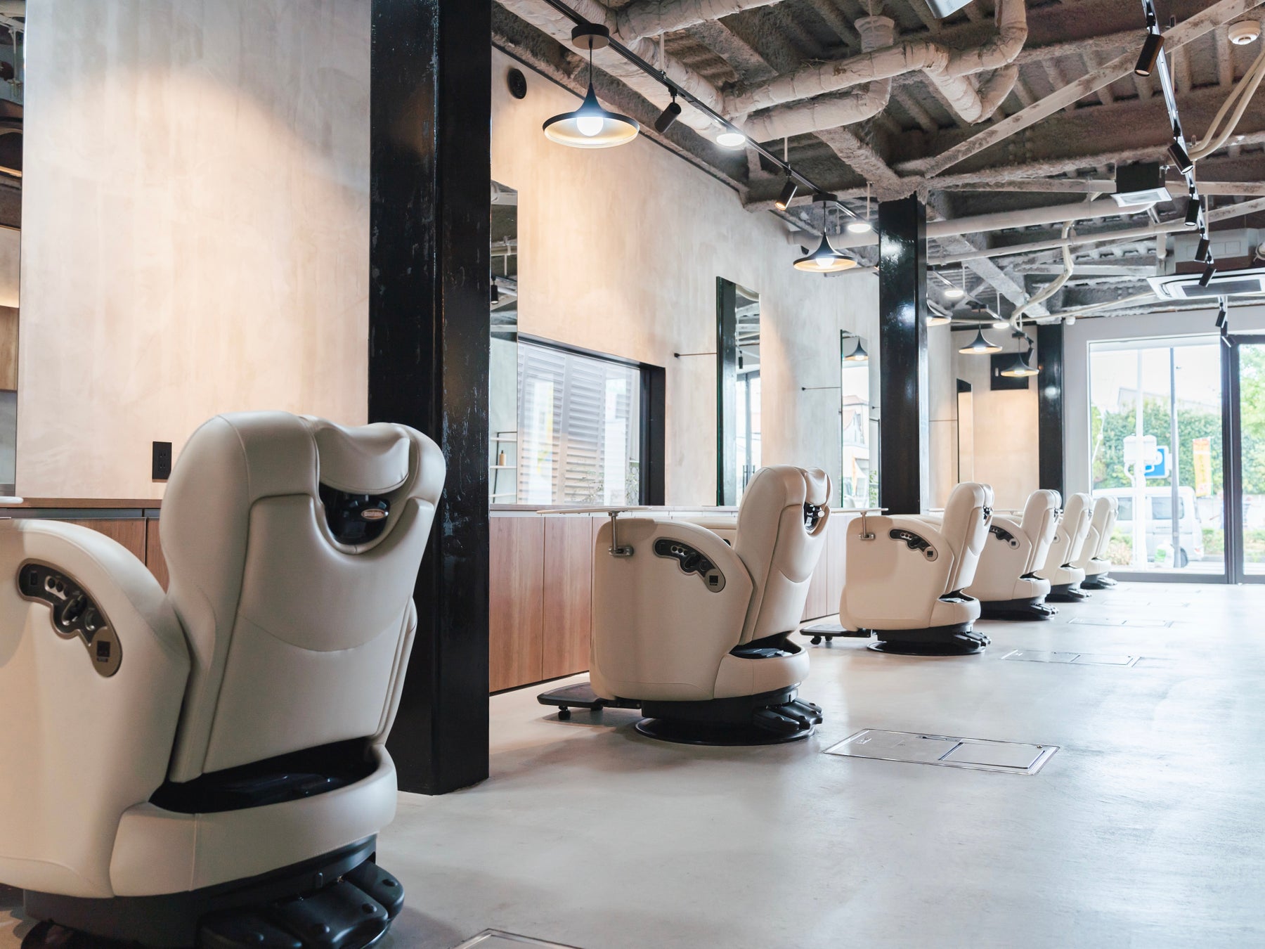 セットブースとシャンプーブースを一体化することで、スペースを有効活用。ソファーとソファーの間隔を広めに設計してるので、隣のゲストが気にならない。