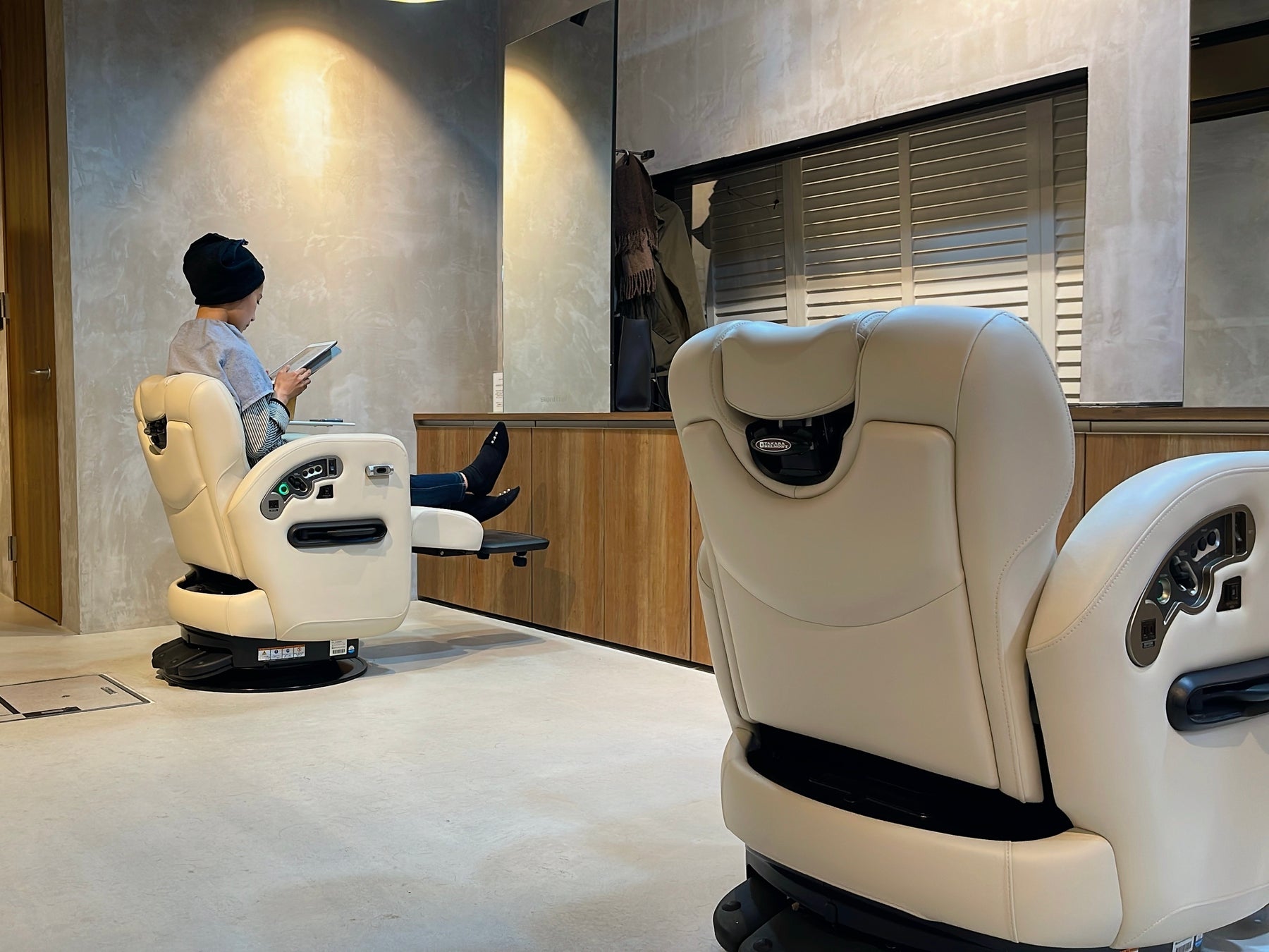 カット中やカラー・パーマの放置時間はレッグレストをお好みの位置に上げて、まるで飛行機のファーストクラスに座ってるようだ。