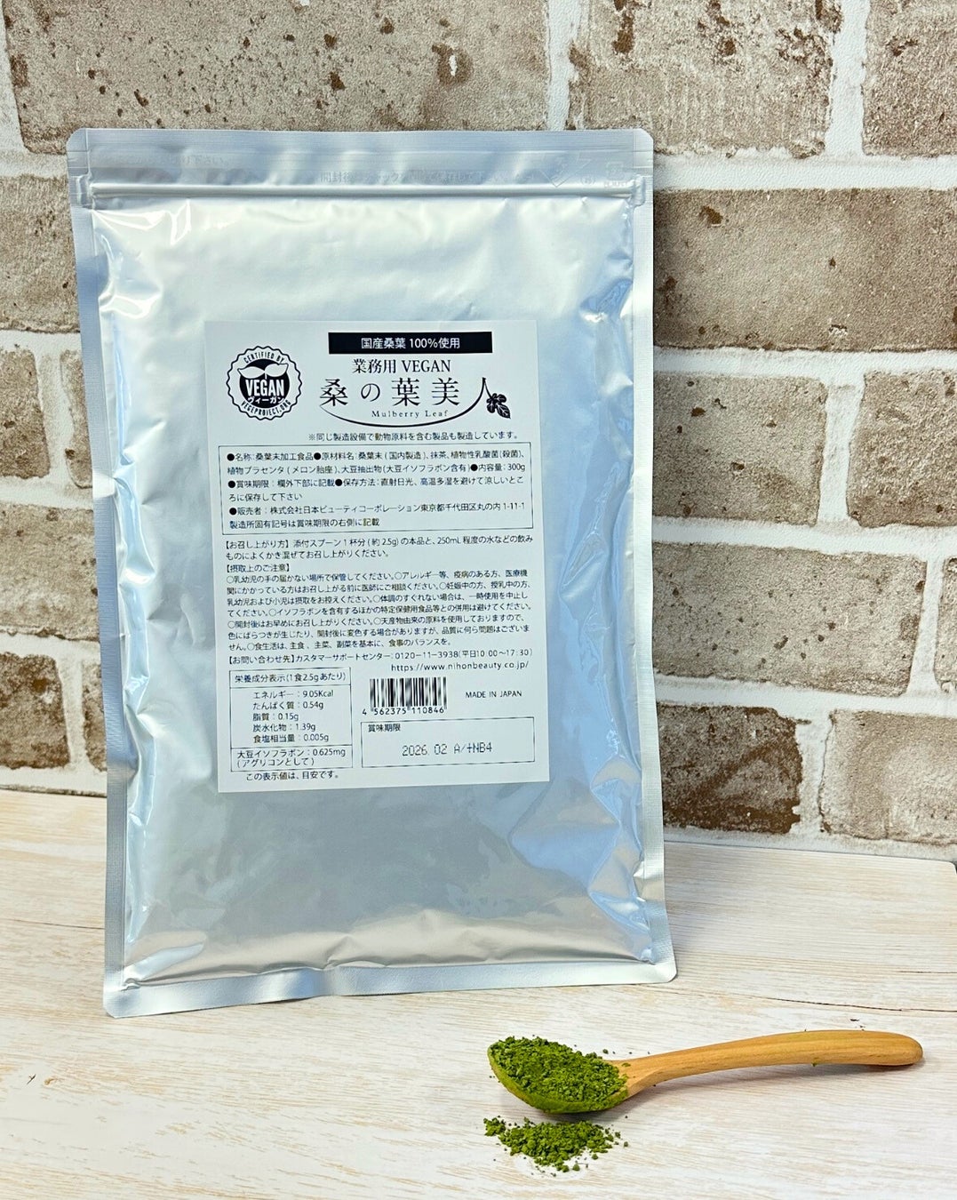 「桑の葉美人」は、2002年9月に発売を開始し、累計65万箱を売り上げた弊社のロングセラー商品です。昨今ご愛用者様より、様々な場所で「桑の葉美人」を楽しみたいというお声を多く頂き、「業務用VEGAN桑の葉美人」を考案いたしました。新たに発売する「業務用VEGAN桑の葉美人」では、地球温暖化や食糧問題などの社会課題への取り組みとして、プラセンタを豚由来からメロン由来へ変更し、ヴィーガン認証を取得いたしました。また、桑葉末に関しても、粒状から粉状へ変更し、味を均一に保てるようになりました。粉状へ変更したことにより、料理や製菓にも馴染みやすくなっております。
