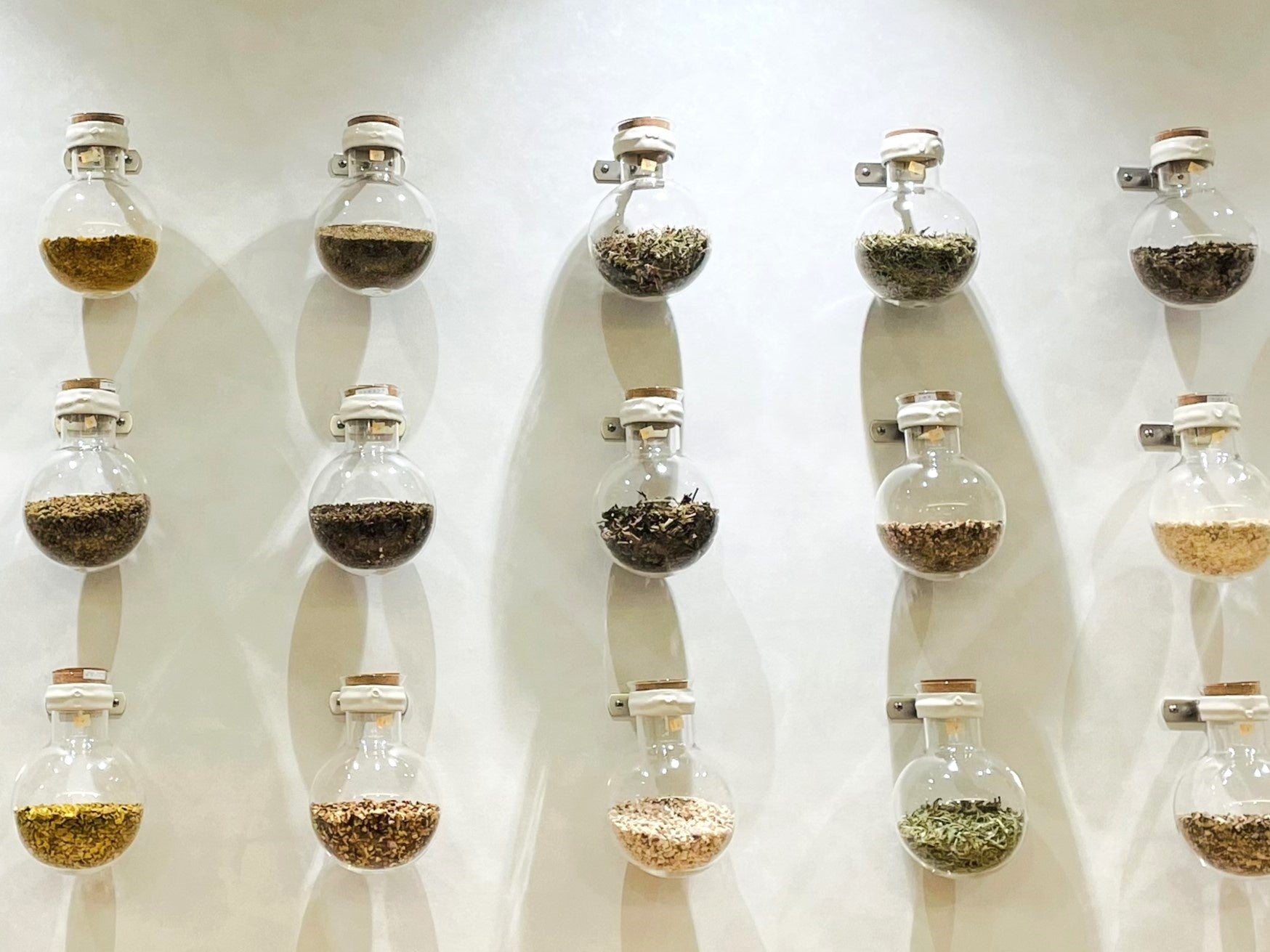 京乃雪のベースとなっているのは、京の天然水で抽出した「和漢植物エキス」。店内には27種類の和漢植物が壁にずらりと並び、実際に目で見てお確かめいただけます。お肌のお悩みや気になっていた商品など、スタッフとの会話を楽しみながら、ゆったりとお買い物をお楽しみくださいませ。