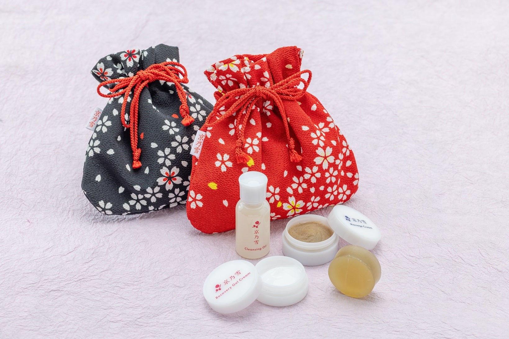 京都らしい桜巾着付きの「旅行セット」は京乃雪の基礎4点が1週間分入ったお得なセット。お肌に合うお化粧品をお探しの方へトライアルセットとしてぴったり。また京都ならではのお土産としても大人気です。