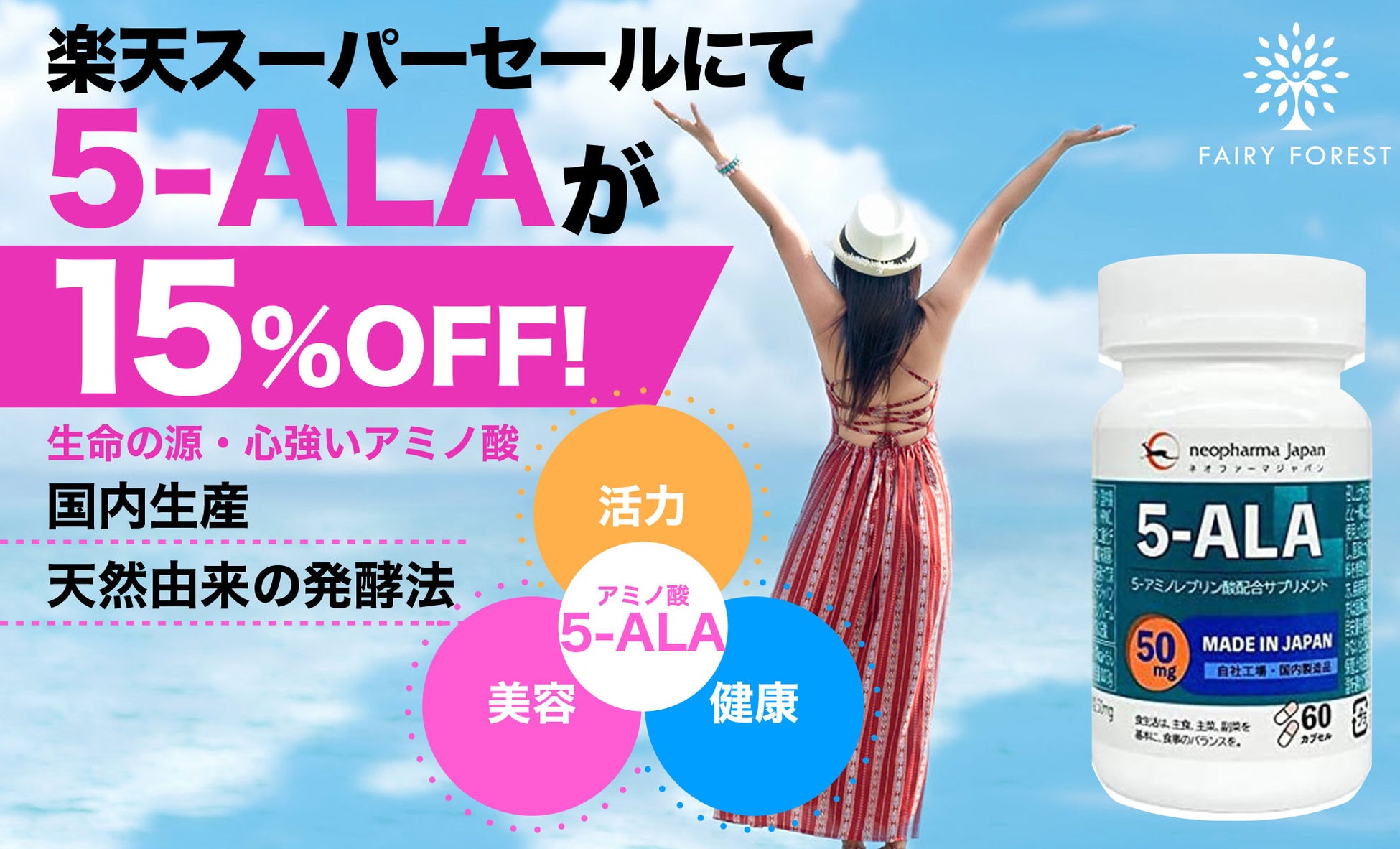 株式会社フェアリーフォレストは、人の悩みに機能する天然のアミノ酸である5-ALA(ファイブアラ)サプリメントを、今年最初の「楽天スーパーセール」にて3月4日(月) 20:00から3月11日(月) 1:59までの間、15%OFFで販売します!