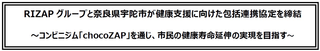RIZAPでは、「コンビニジムchocoZAP」を通じた地方創生に貢献する健康支援に取り組んでおり、コンビニジムを活用した取り組みを通じ、運動習慣の定着化を推進しております。当社グループは奈良県宇陀市との連携を通じ、市民の健康づくりの分野で相互に協力することで健康寿命の延伸を推進し、社会に必要とされる企業を目指してまいります。