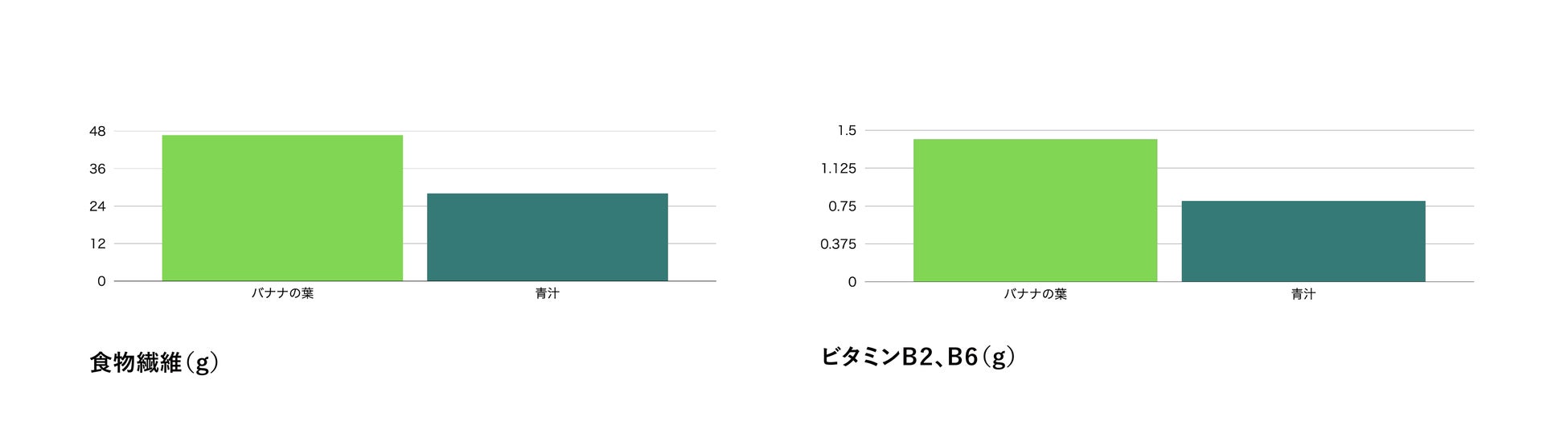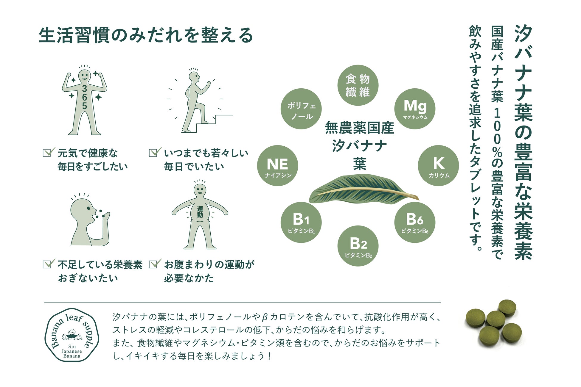 バナナの中で一番栄養がある部分は「葉っぱ」です。海外では農薬を使用しているため二次利用はされますが食用ではありませんでした。我々が育てている「汐バナナ」は完全無農薬で栽培している為、葉っぱも食用で利用が可能です。一番栄養価のある部分を捨てるのはもったいないと考え皮のサプリメント開発時に相談したユーグレナ社に依頼しました。想像を遥かに超えるバナナの葉に含まれる豊富な栄養を遥かに超えるタブレットにしたことで手軽に摂取できるので、忙しい年代問わず様々な方にお召し上がりいただけます。
