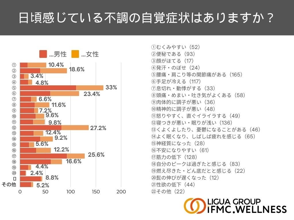 【回答】最も多かったのが腰痛・肩こり等の関節痛がある(33%)、のほかに寝つきが悪い・眠りが浅い(27%)、筋力の低下(25%)・手先が冷える(23%)など。