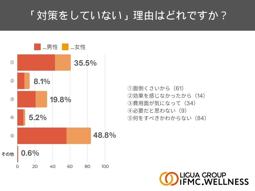 対策をしていない人の、対策をしていない理由が「めんどくさい、何をすべきかわからない」という回答が多かったことから、行動に出るまでのハードルが高いことが分かります。