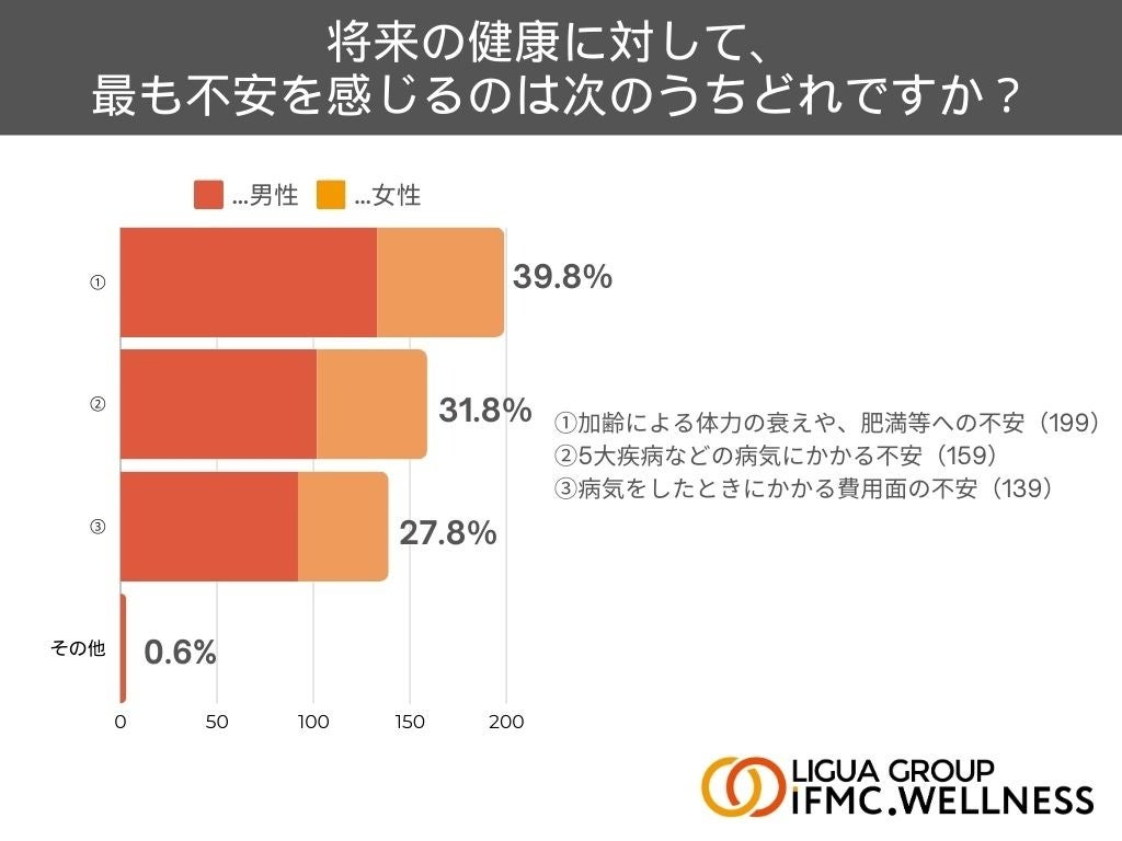 【回答】加齢による体力の衰えや肥満・5大疾病などの病気にかかる不安・病気の治療に対する費用面の不安の順で多少差はあるものの、回答が分散する結果に。男女比も同様。