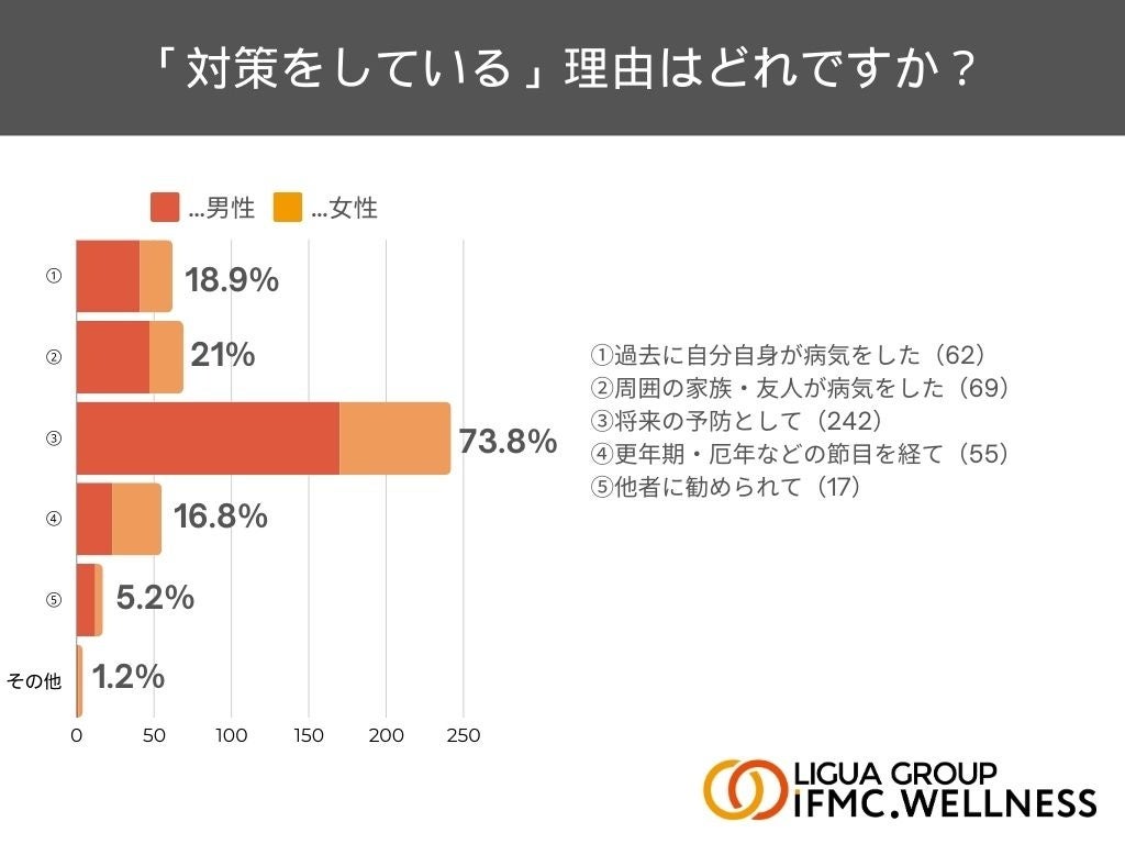 【回答】「対策をしている理由」は将来の予防として(73%)、対策をしていました。