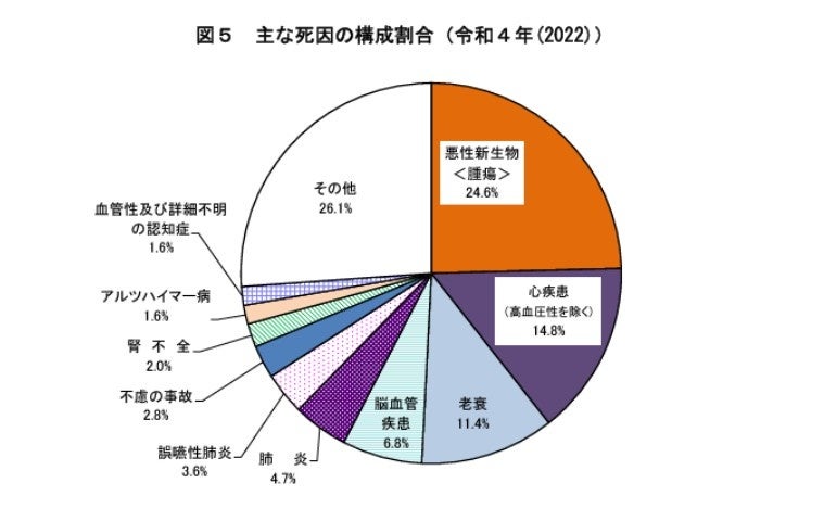 全体の死因の全体の死因の46.2%、つまり約半分近くに生活習慣病が関わっています。