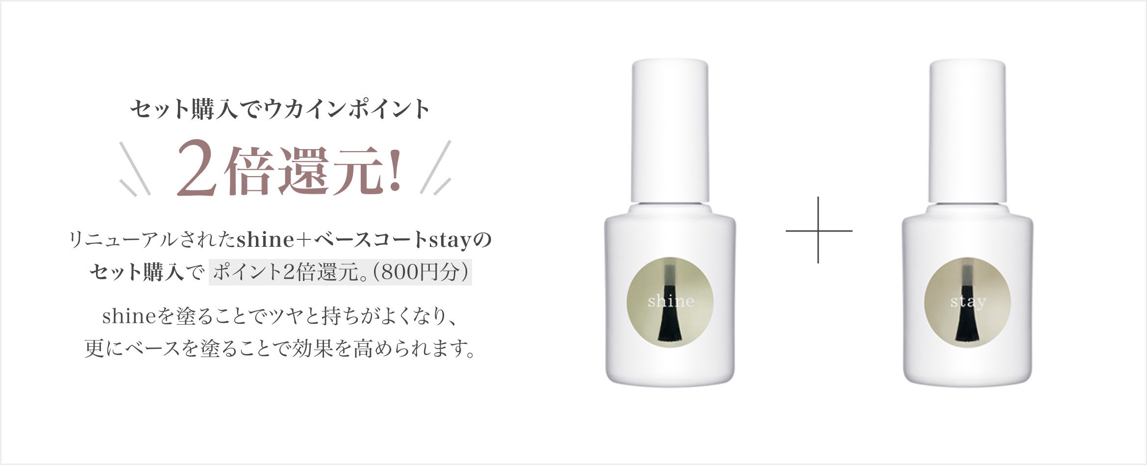 数量限定でリニューアルしたトップコート シャイン+ベースコート ステイをセットでご購入いただいた方にukainnポイント2倍プレゼント。