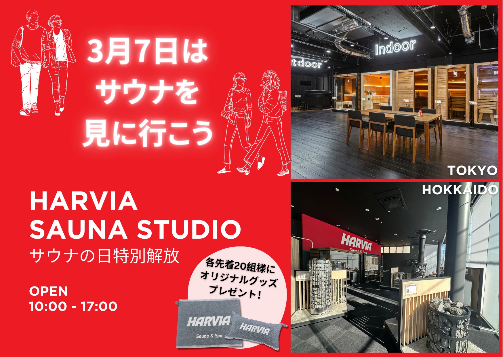 株式会社HARVIA JAPANは3月7日“サウナの日”に合わせて、普段は予約制の旗艦ショールームHARVIA SAUNA STUDIO(ハルビアサウナスタジオ)に予約なしで来場できる特別解放を実施します。当日は各店舗先着20組様にオリジナルサウナグッズをプレゼント!「自宅用サウナルームを見てみたい」「ハルビア製品を実際見てみたい」という方、ぜひこの機会にご来場ください。ハルビアサウナスタジオ北海道では実際にサウナ体験も可能です。