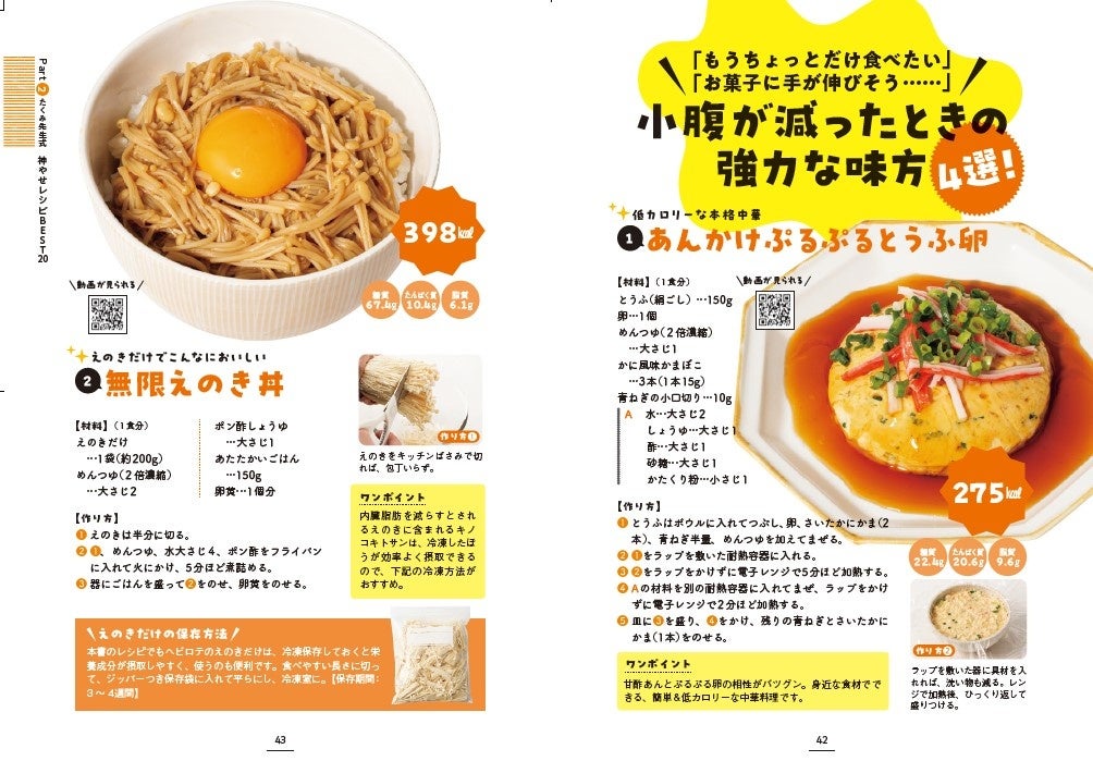 間食だけでなく、主菜、主食にもぴったりの「無限えのき丼」などなど全53品を掲載。